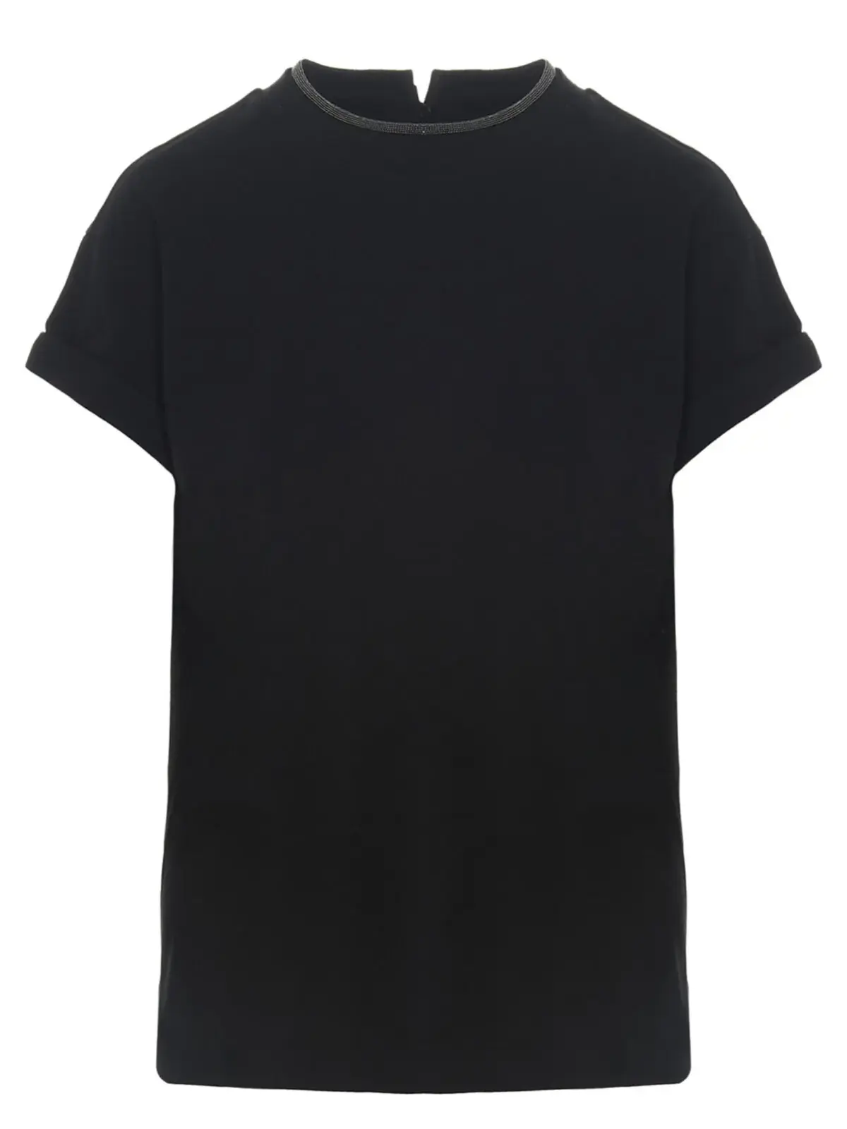 Чорна жіноча футболка Brunello Cucinelli з круглим вирізом виконана з м’якої бавовняної джерсі з додаванням еластану для ідеальної посадки. Вишуканий дизайн доповнюють делікатні декоративні деталі, застібка на ґудзики та витончені вирізи на спині, що надають виробу неперевершеного статусу та універсальної елегантності.