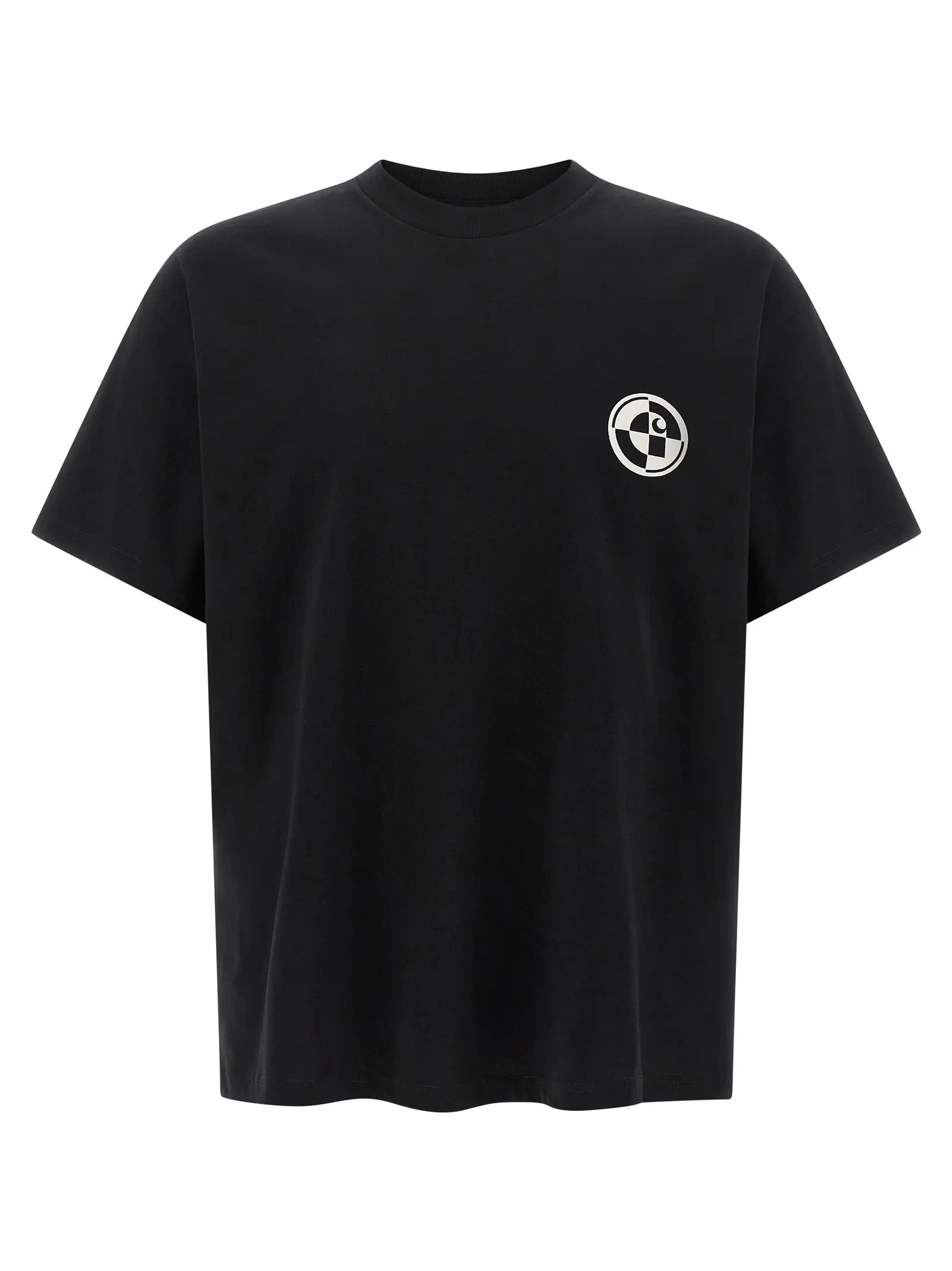 Чорна футболка з органічної бавовни середньої щільності поєднує в собі стильний графічний принт на передній та задній частинах із вишуканим дизайном із круглим вирізом горловини та короткими рукавами з опущеними плечима. Вона вирізняється високою якістю, екологічністю й універсальністю, підкреслюючи статус і бездоганний смак свого власника.