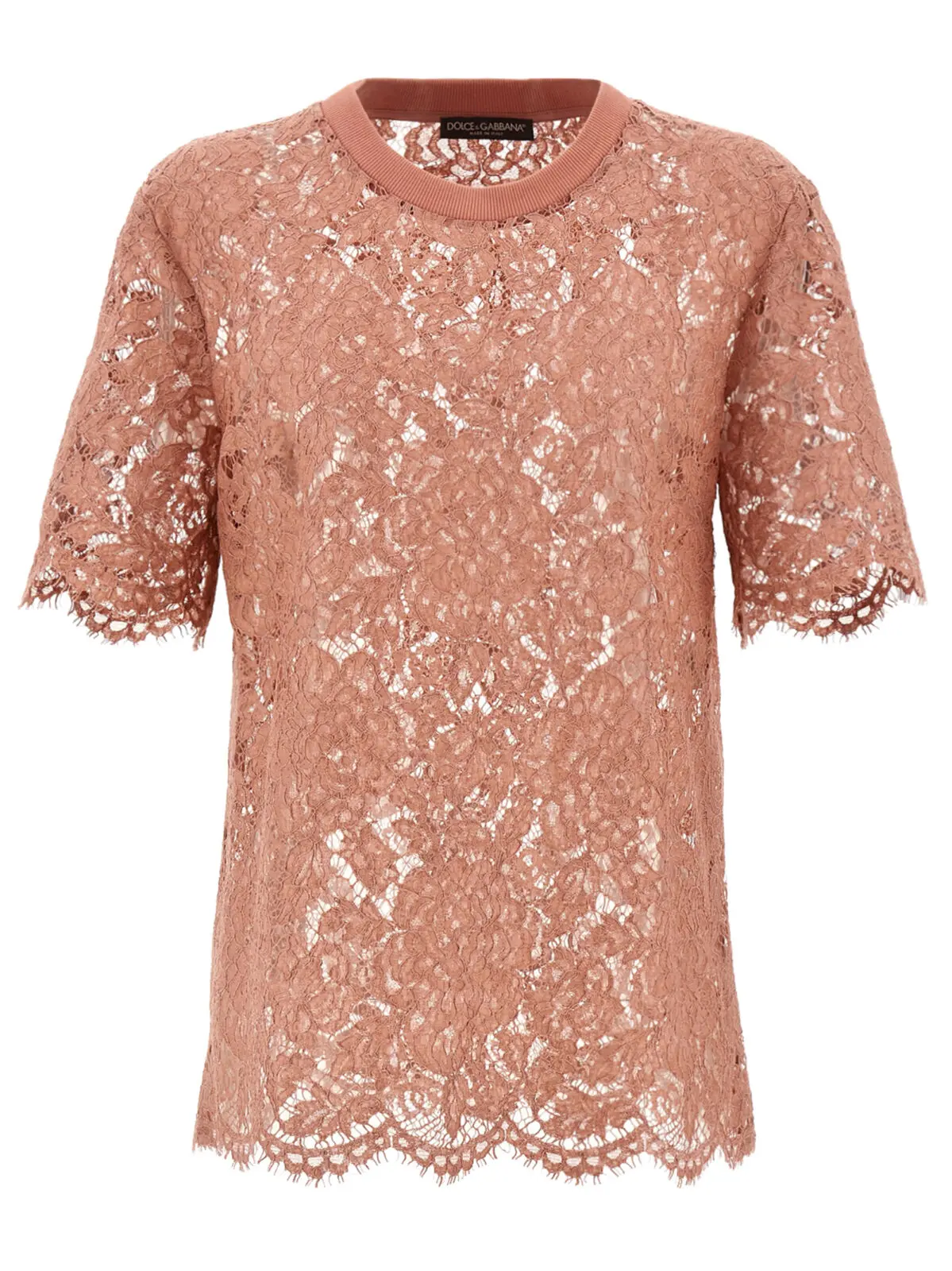 Вишукана жіноча футболка Dolce Gabbana ніжного рожевого відтінку виготовлена з унікального поєднання віскози, бавовни та поліаміду, що забезпечує легкість і комфорт. Елегантний круглий виріз та короткі рукави підкреслюють стиль, а мереживні деталі додають витонченості та статусності цьому універсальному виробу.