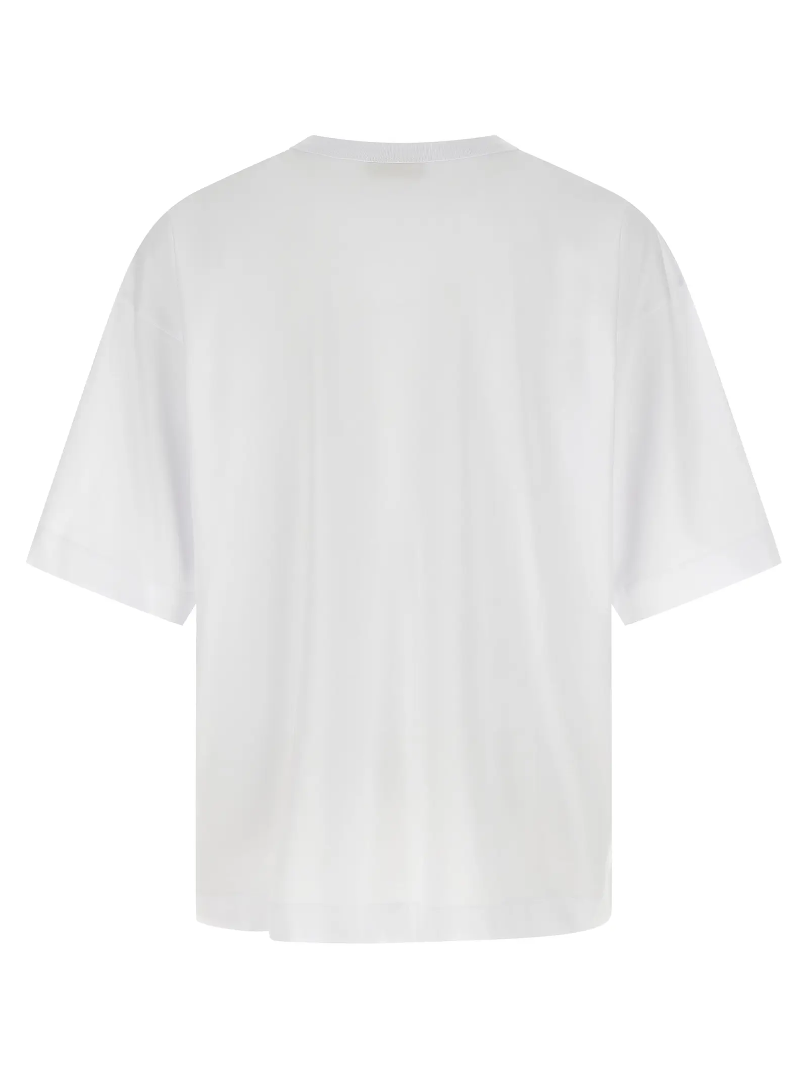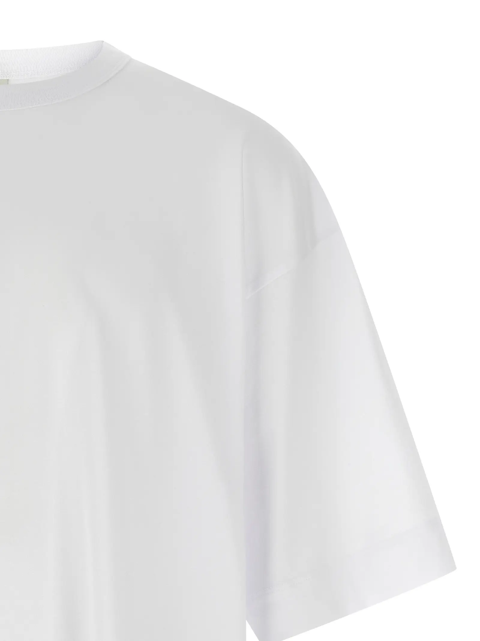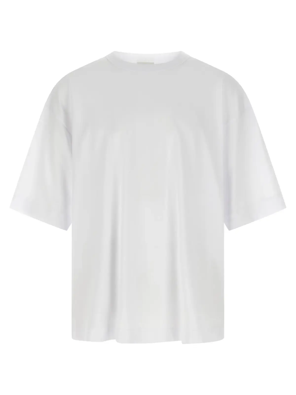 Футболка з колекції Dries Van Noten виготовлена з високоякісної 100% бавовни, що забезпечує максимальний комфорт і дихаючі властивості. Вишуканий дизайн з класичним круглим вирізом і заниженими плечима підкреслює сучасний стиль, створюючи неперевершений образ статусу та елегантності.