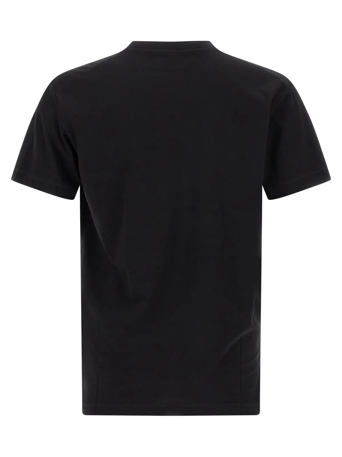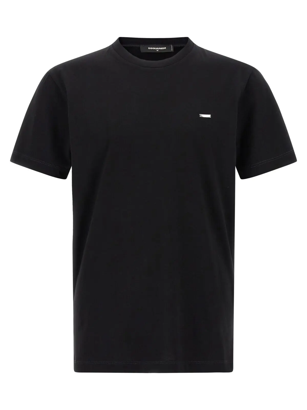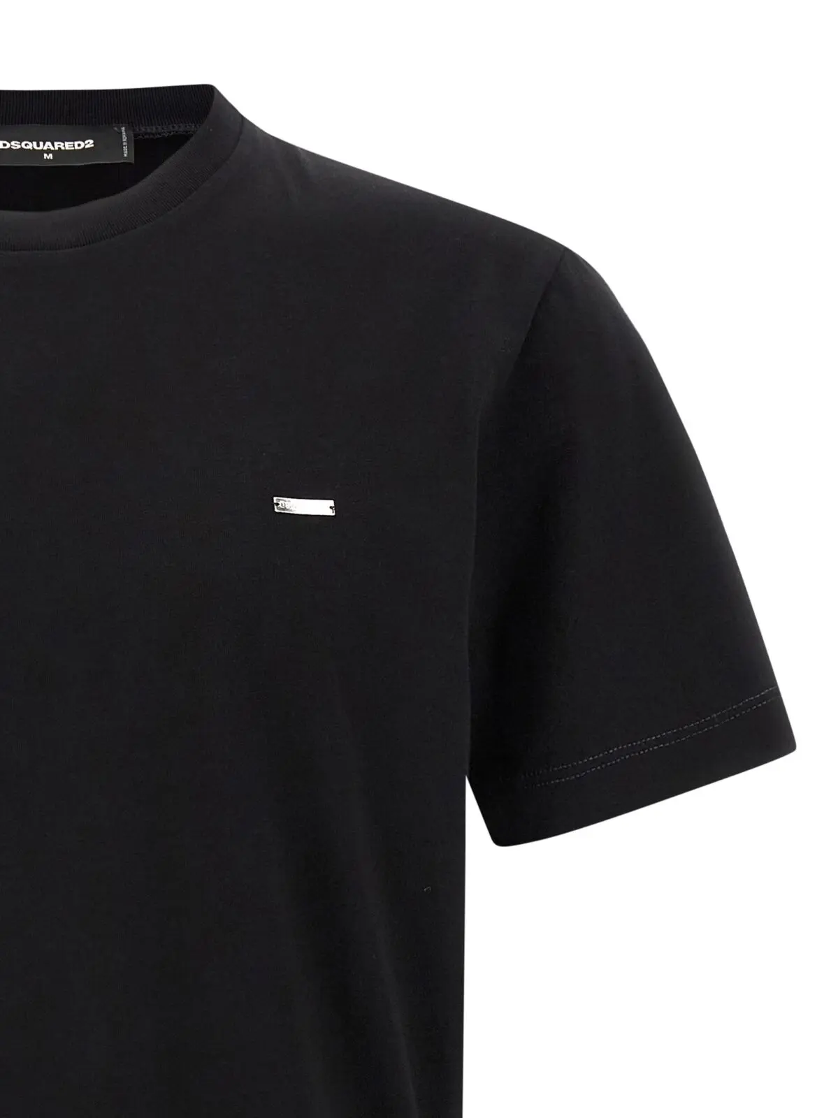 Чорна чоловіча футболка із 100% бавовняного джерсі поєднує вишукану простоту з сучасним дизайном, прикрашена металевою пластинкою з витонченим гравіюванням логотипу спереду. Витончений крій із круглим вирізом та короткими рукавами забезпечує комфорт і універсальність, підкреслюючи статус і бездоганний стиль.