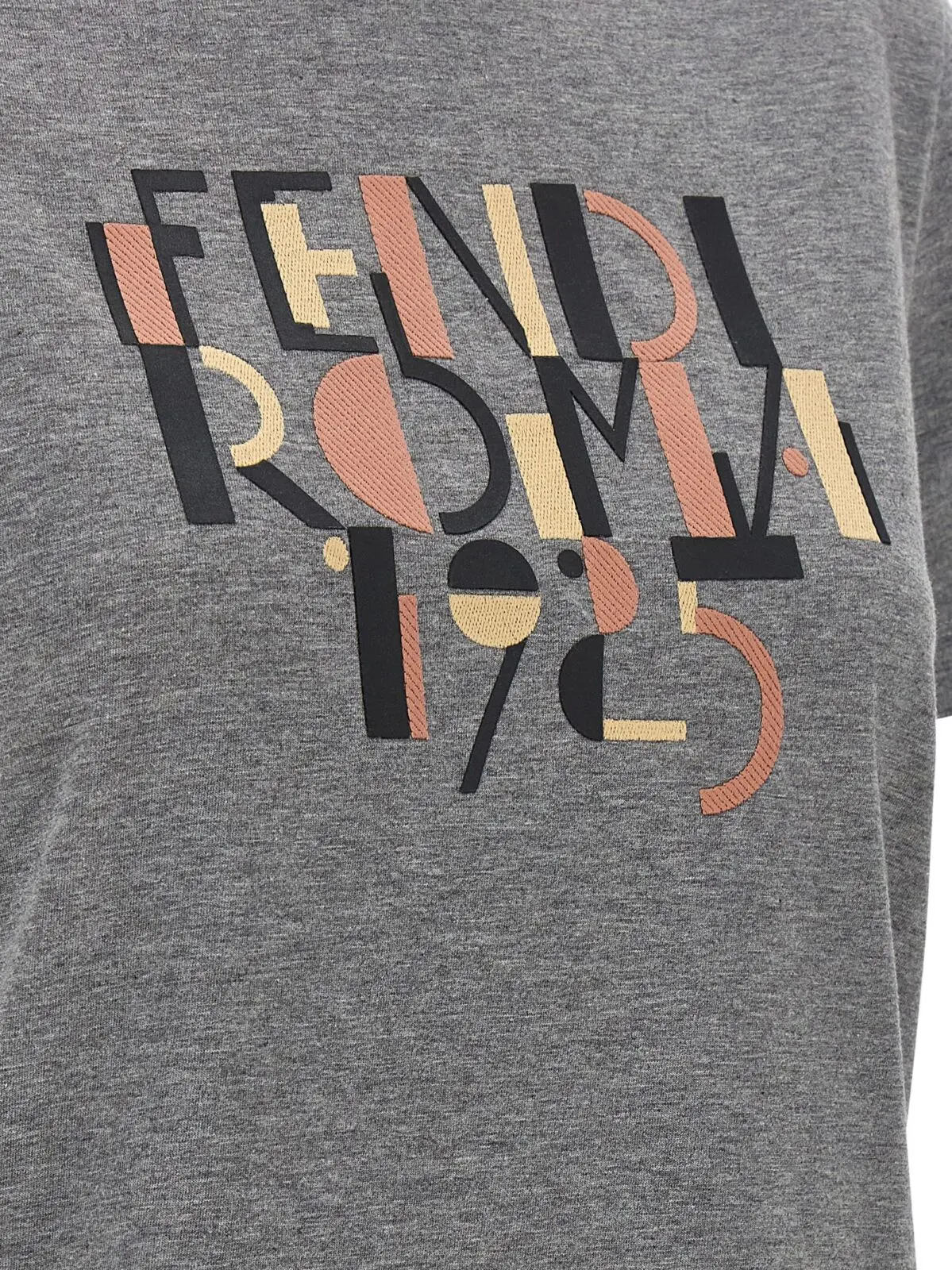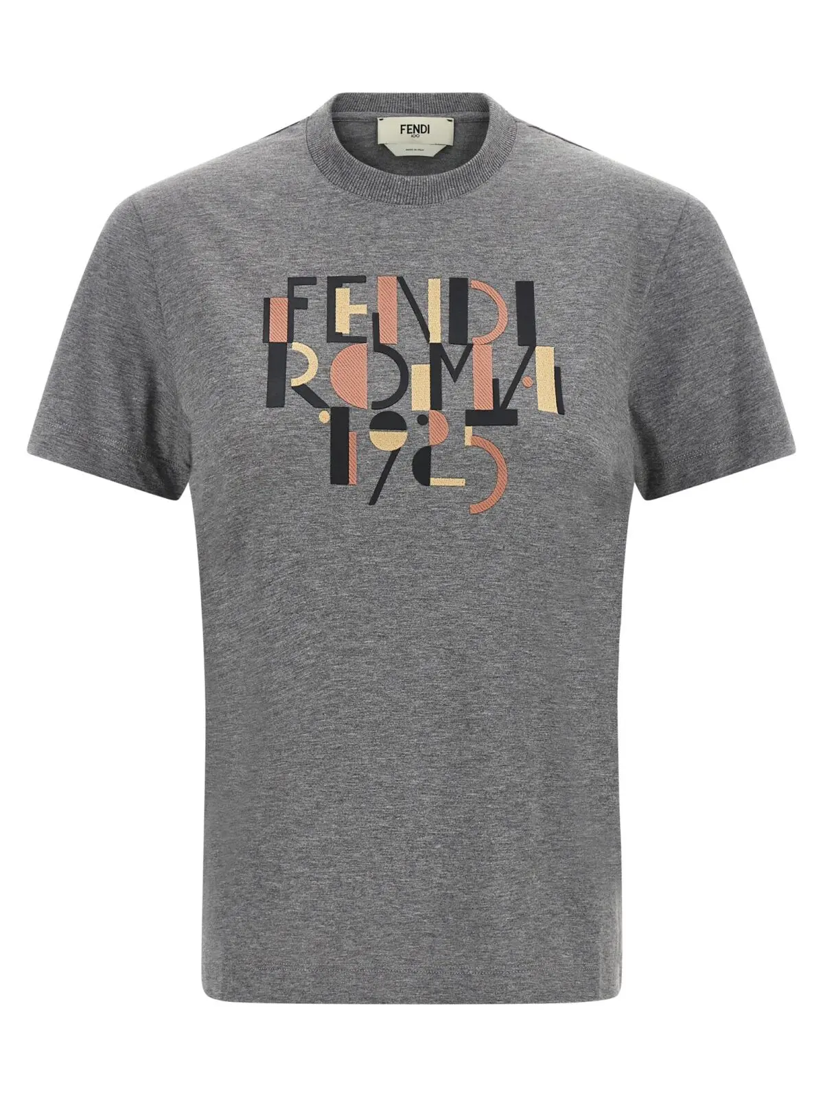 Ця жіноча футболка виготовлена з високоякісного бавовняного меланжевого джерсі, поєднує в собі витонченість і комфорт. Елегантний принт і вишивка з написом Fendi Roma 1925 підкреслюють статус і бездоганний стиль, роблячи виріб універсальним доповненням до вашого гардеробу.