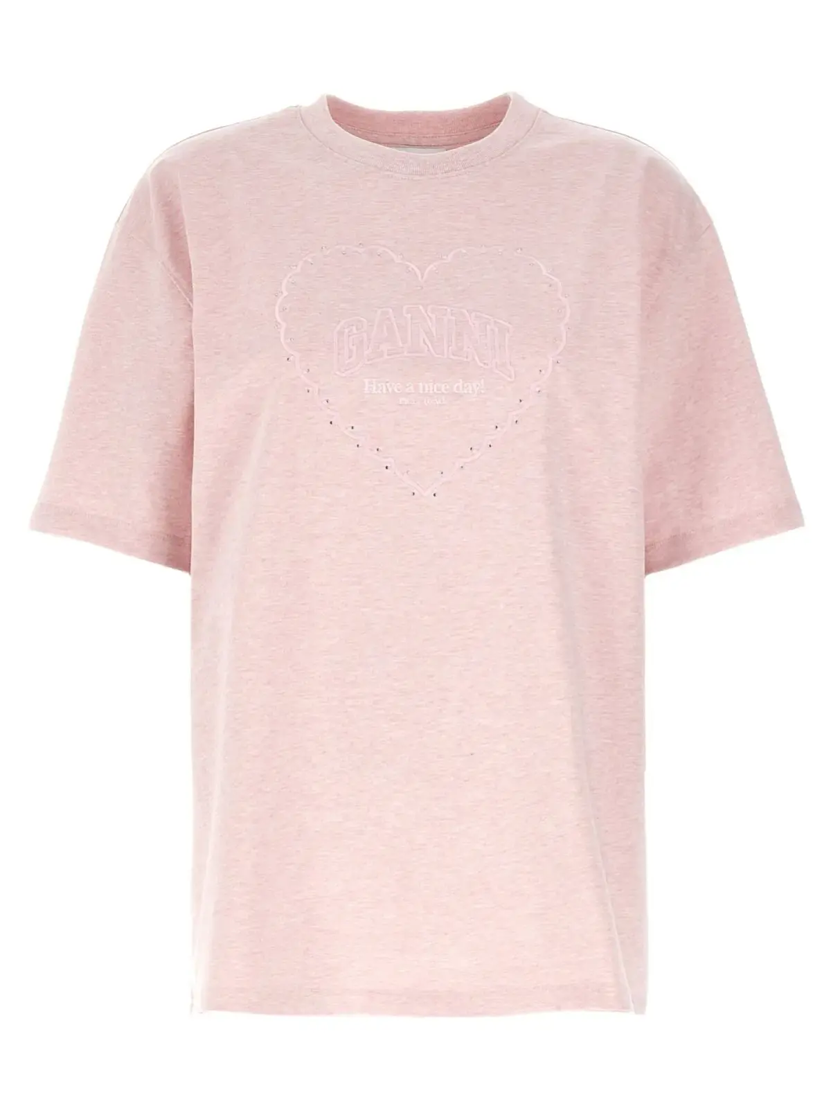 Футболка Ganni Heart вишуканого рожевого кольору стане яскравим акцентом вашого гардеробу. Виконана з меланжевого органічного бавовняного матеріалу, вона забезпечує комфорт та дбайливе ставлення до природи. Елегантний дизайн з вишитим логотипом, прикрашеним стразами, підкреслює статус та стиль. Круглий виріз та короткі рукави створюють універсальний силует, що легко поєднується з різними образами, даруючи вам відчуття розкоші та сучасності.