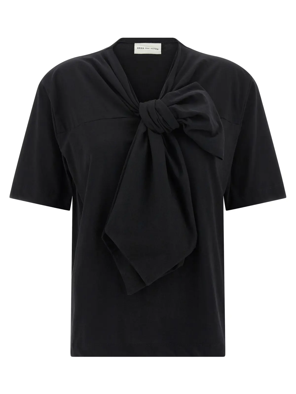 Жіноча футболка Hebitta чорного кольору виконана з високоякісної 100% бавовни, що гарантує комфорт і довговічність. Вишуканий дизайн з коміром лаванд’єр підкреслює елегантність і створює вишуканий образ, поєднуючи інноваційність і універсальність для стильних повсякденних і святкових образів.