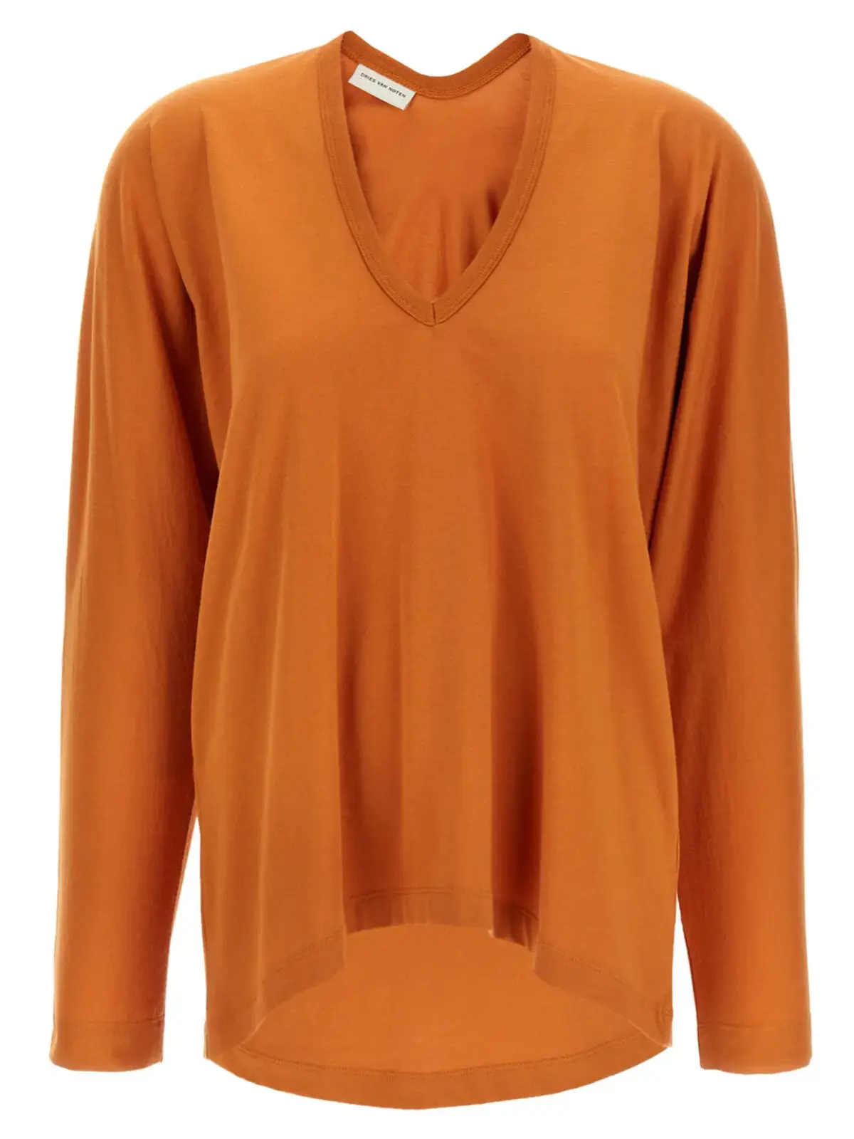 Вишукана жіноча футболка з колекції Hena Bis виготовлена з високоякісної еластичної бавовни, що забезпечує комфорт і ідеальну посадку. Оранжевий відтінок та вишуканий V-подібний виріз надають образу вишуканості, підкреслюючи статус і стиль сучасної модниці.