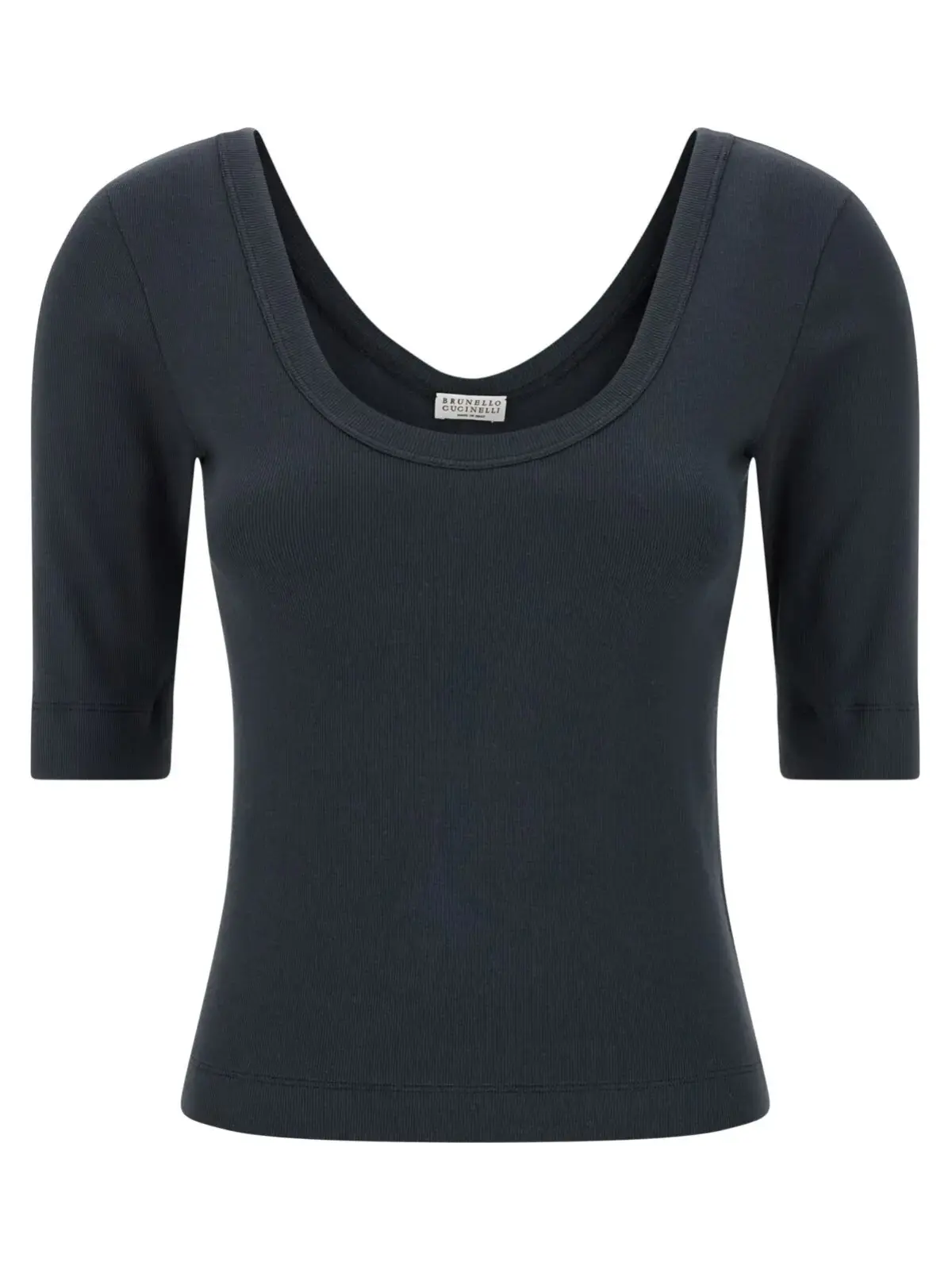 Ця синя футболка з ребристої бавовняної джерсі з еластаном поєднує витончену елегантність із комфортом завдяки широкому круглому вирізу спереду і ззаду, а також вишуканій деталі на спині. Ідеальний вибір для створення стильного, універсального образу з високим статусом.