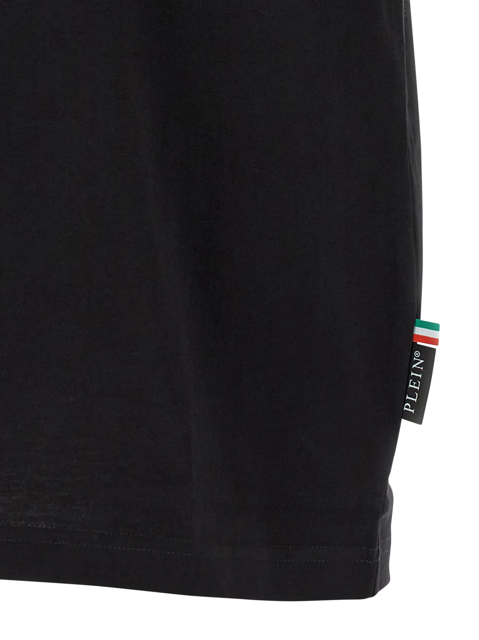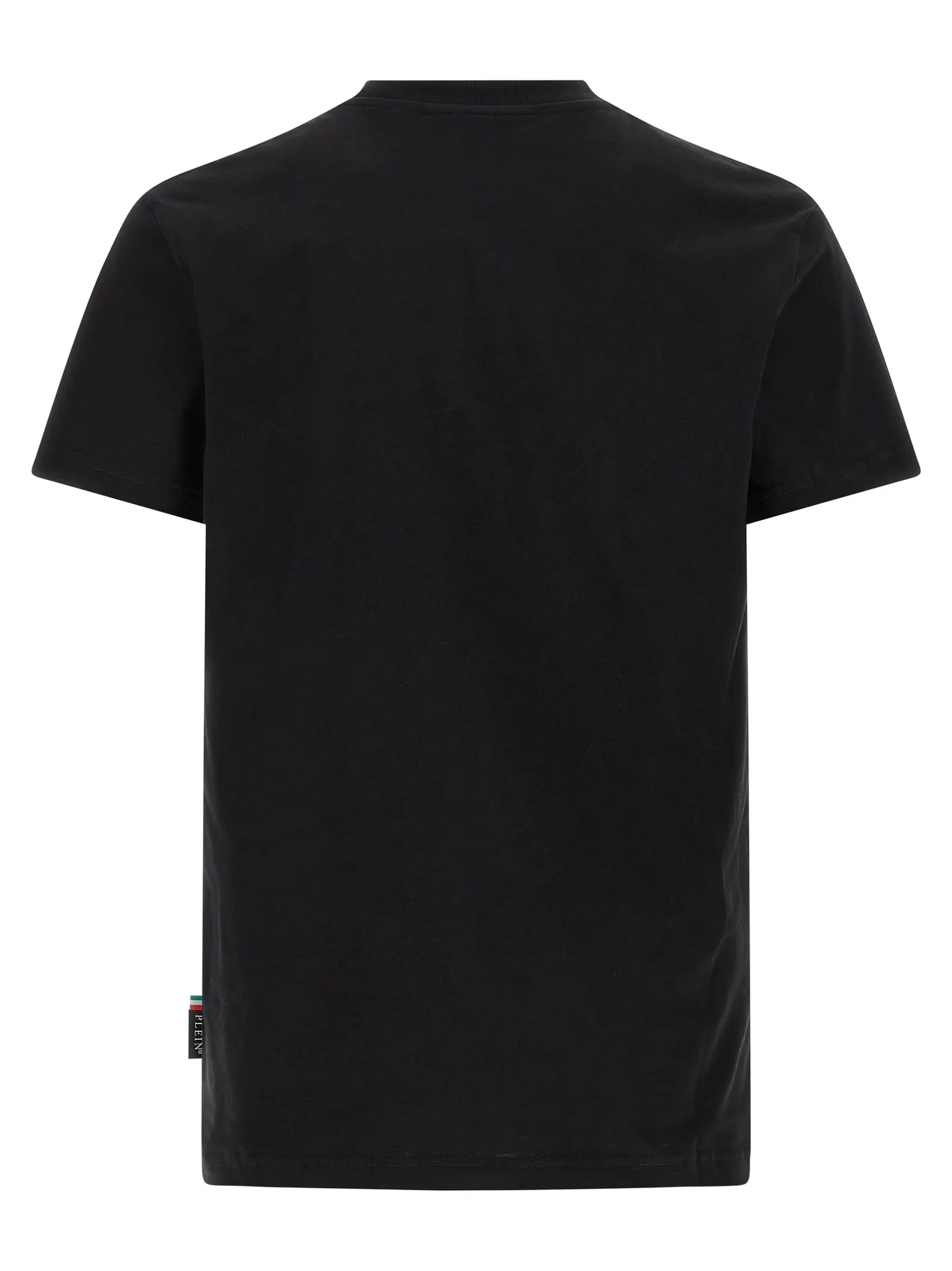 Чорна футболка з бавовняного джерсі поєднує в собі неперевершену якість та інноваційний дизайн із принтом скляського черепа, шкіряною нашивкою і металевим логотипом на грудях. Цей виріб підкреслює стиль і статус, забезпечуючи комфорт і універсальність для сучасного чоловіка.