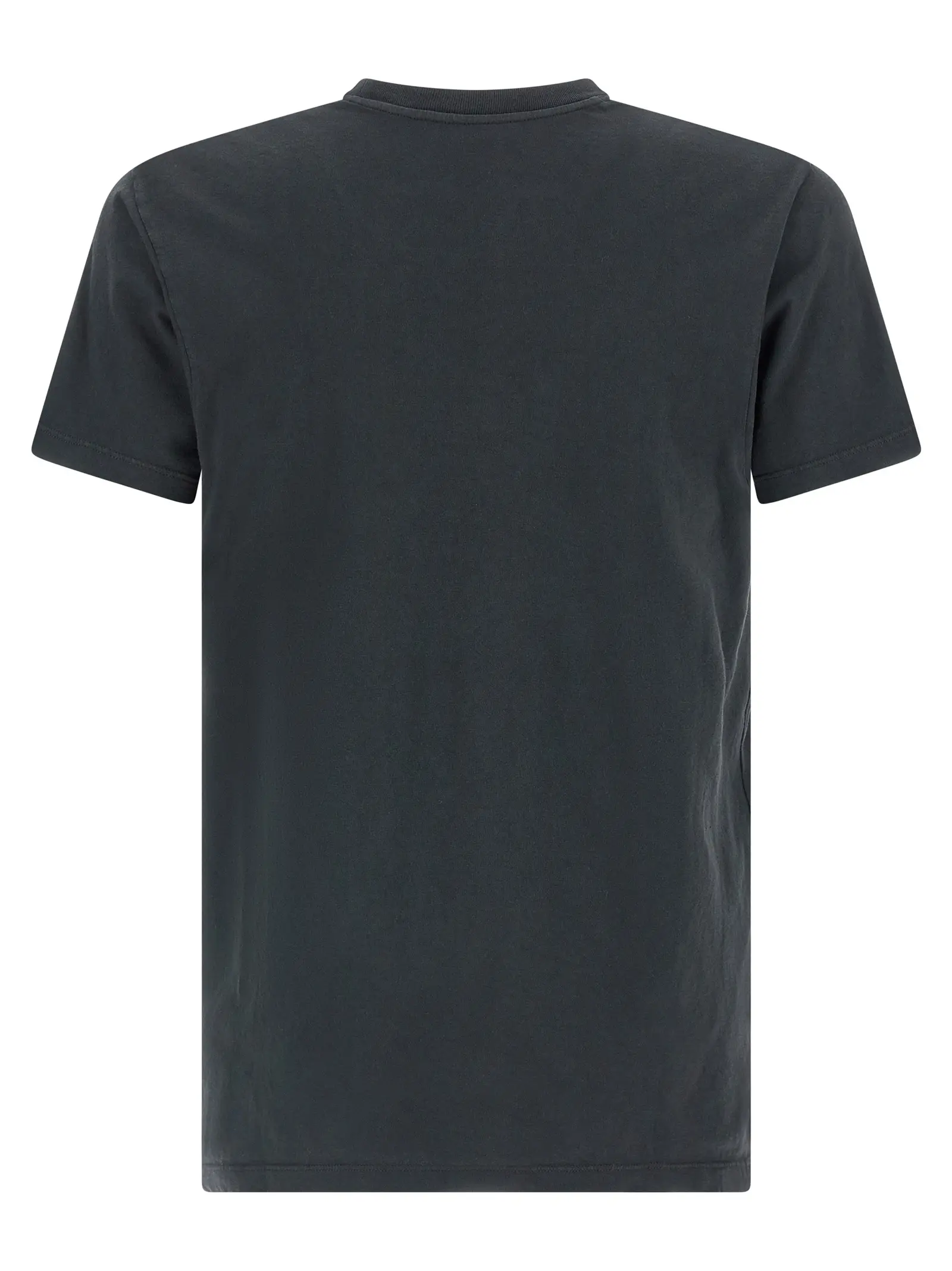 Чорна футболка з кільцеподібної бавовни джерсі поєднує в собі інноваційний вигорілий ефект та вишуканий принт спереду, що підкреслює сучасний стиль і статус. Круглий виріз, короткі рукави та характерні чотири шви на спині забезпечують неперевершений комфорт і універсальність у будь-якому гардеробі.