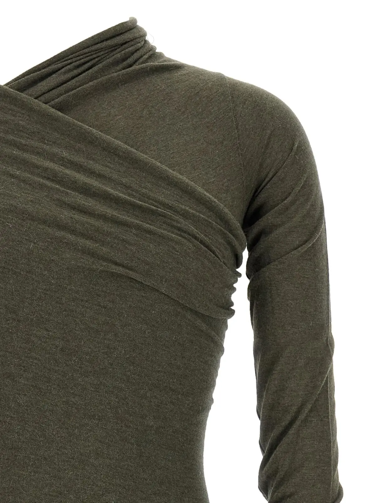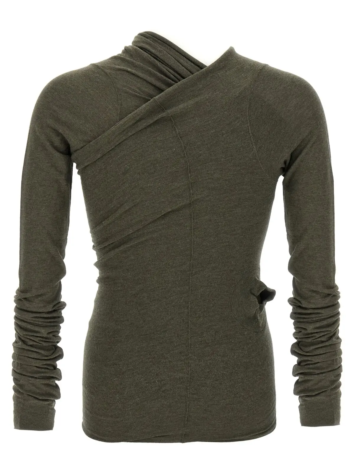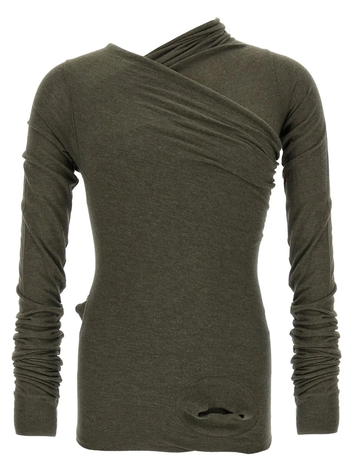 Ця чоловіча футболка з довгими рукавами вишукано поєднує шерсть, ангору та віскозу, забезпечуючи неперевершений комфорт і тепло. Унікальний дизайн із перехресною драпіровкою на передній та задній частинах шиї та витонченими круглими отворами підкреслює інноваційність і стиль, надаючи образу елегантності та статусу.