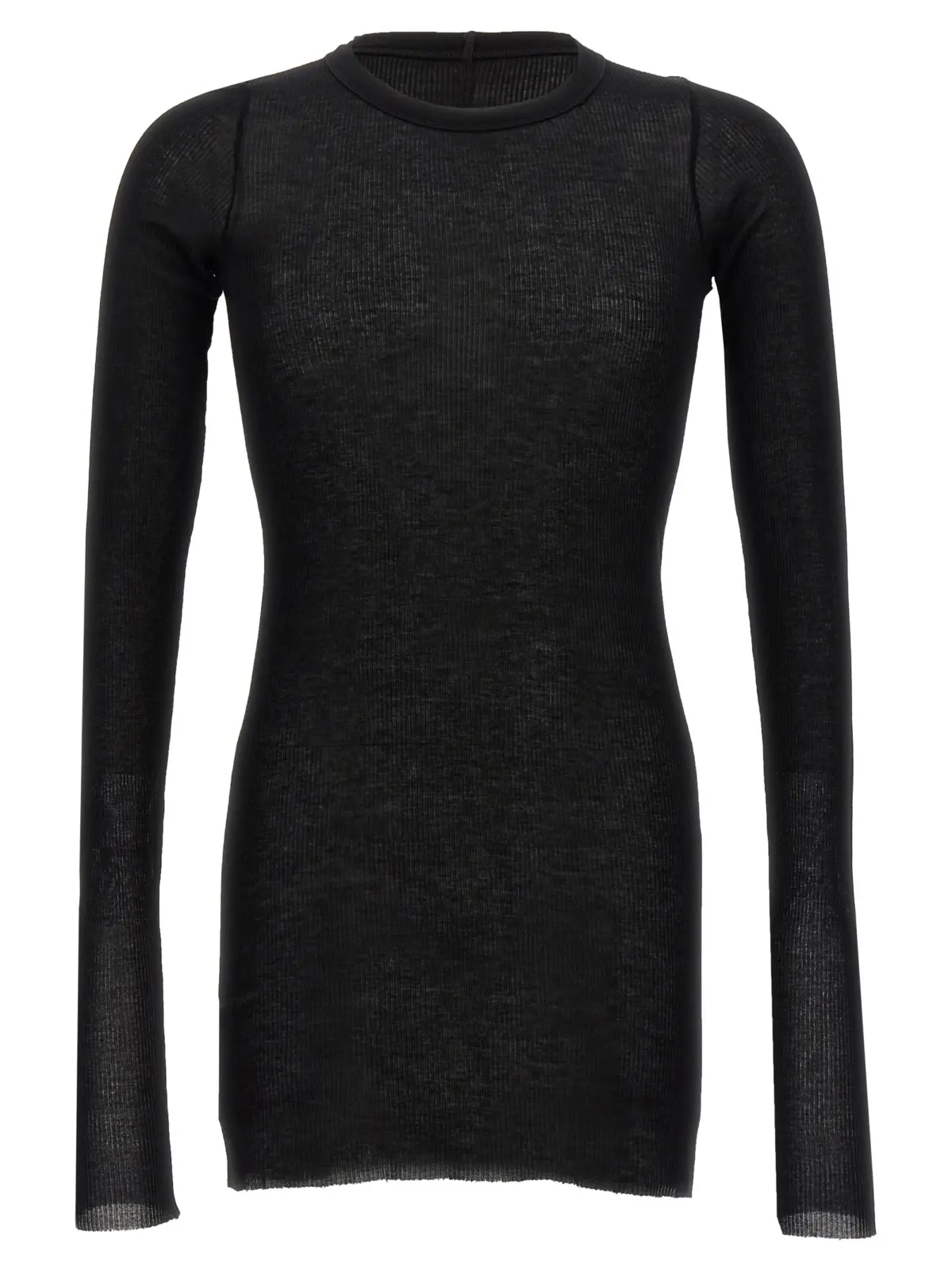 Ніжне сяйво шовку у поєднанні з м’якою віскозою створює витончену фактуру в рубчик, що делікатно облягає тіло. Подовжені рукави та класичний круглий виріз формують виразний силует, а необроблений край низу додає образу легкої зухвалості. Такий трикотаж дарує винятковий комфорт і стає основою багатошарових образів, сповнених невимушеної естетики.