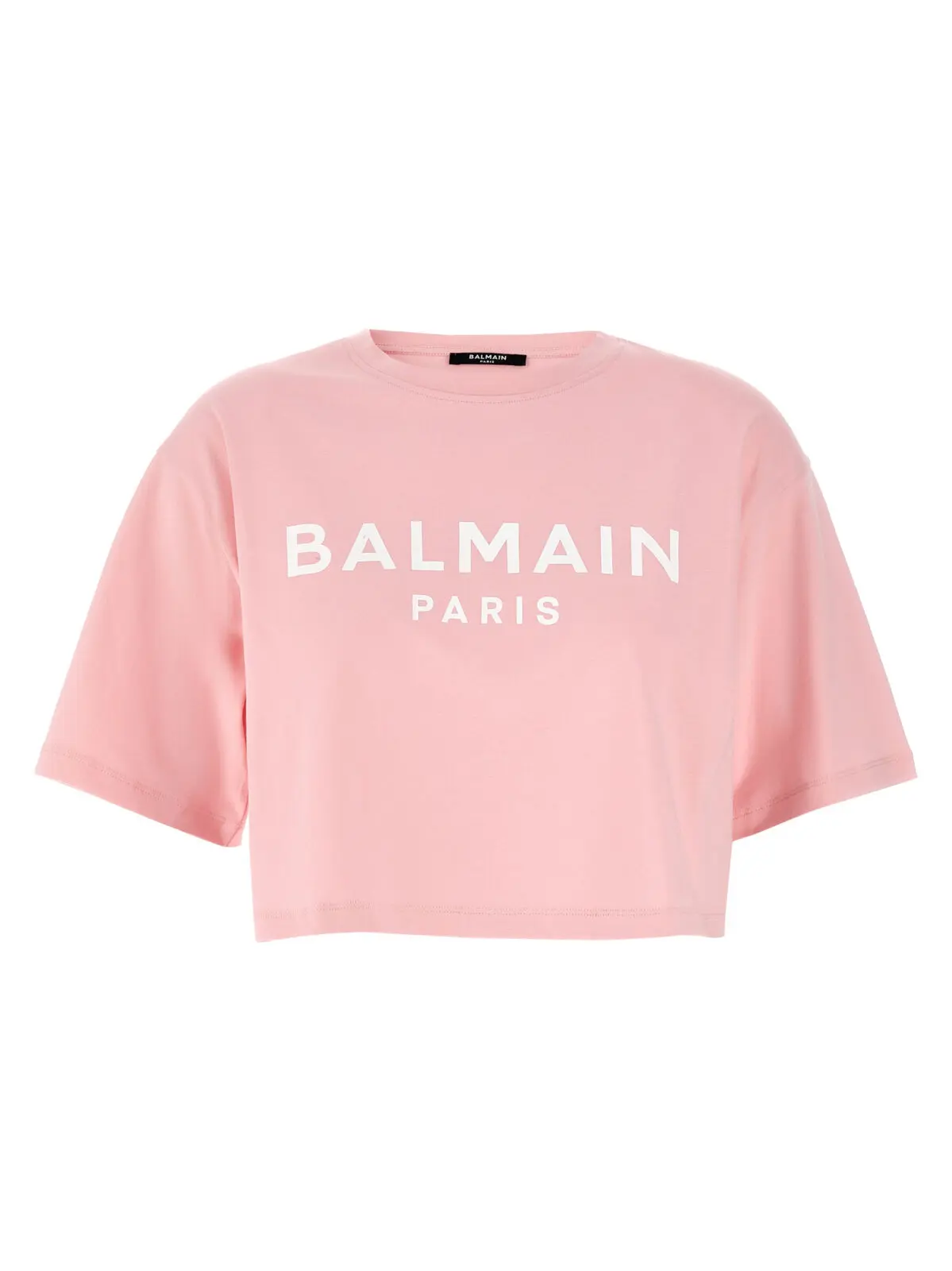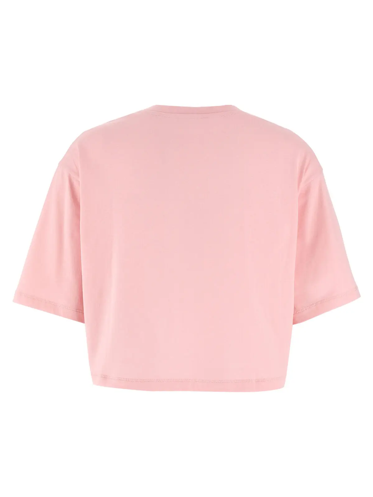 Укорочена жіноча футболка ніжно-рожевого відтінку виготовлена з органічної бавовни найвищої якості, має елегантний круглий виріз і короткі рукави. Вишуканий логотип спереду підкреслює статус і сучасний стиль, поєднуючи інноваційність із універсальністю для створення бездоганного образу.