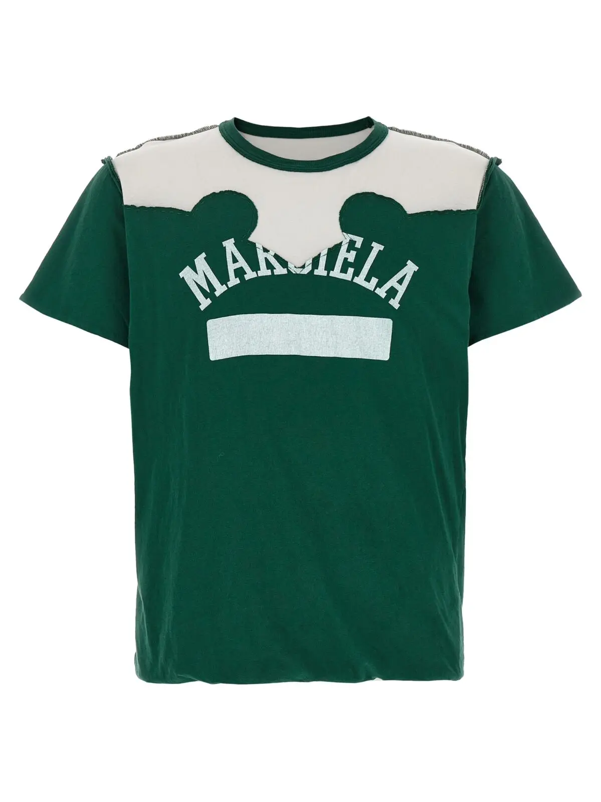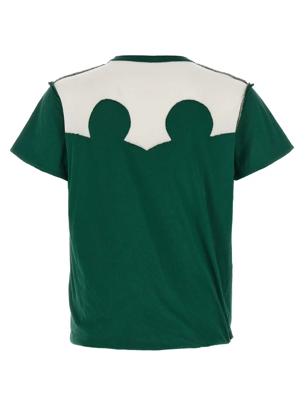 Чоловіча футболка Western patchwork від Maison Margiela в зеленому кольорі. Виготовлена з 100% бавовни, ця футболка має круглий виріз і подвійний ефект шару, зігнутий внизу. Цей унікальний дизайн додає особливого шарму вашому образу.