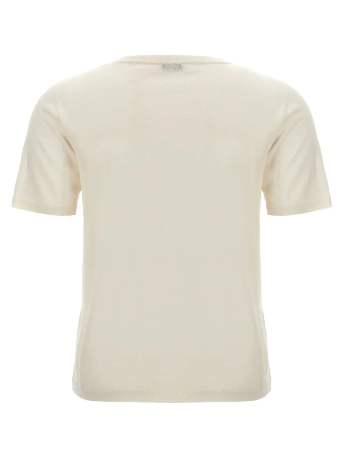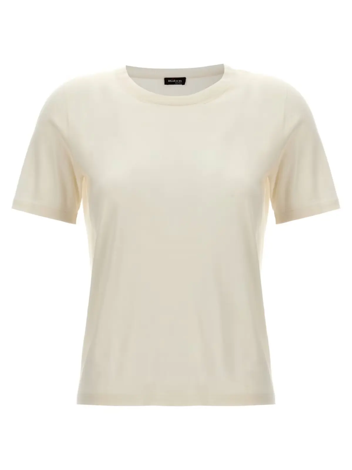 Елегантна біла жіноча футболка Kiton, виготовлена з вишуканої суміші кашеміру (70%) та шовку (30%). Має короткі рукави та круглий виріз. Особливу родзинку додає металева планка з логотипом бренду.