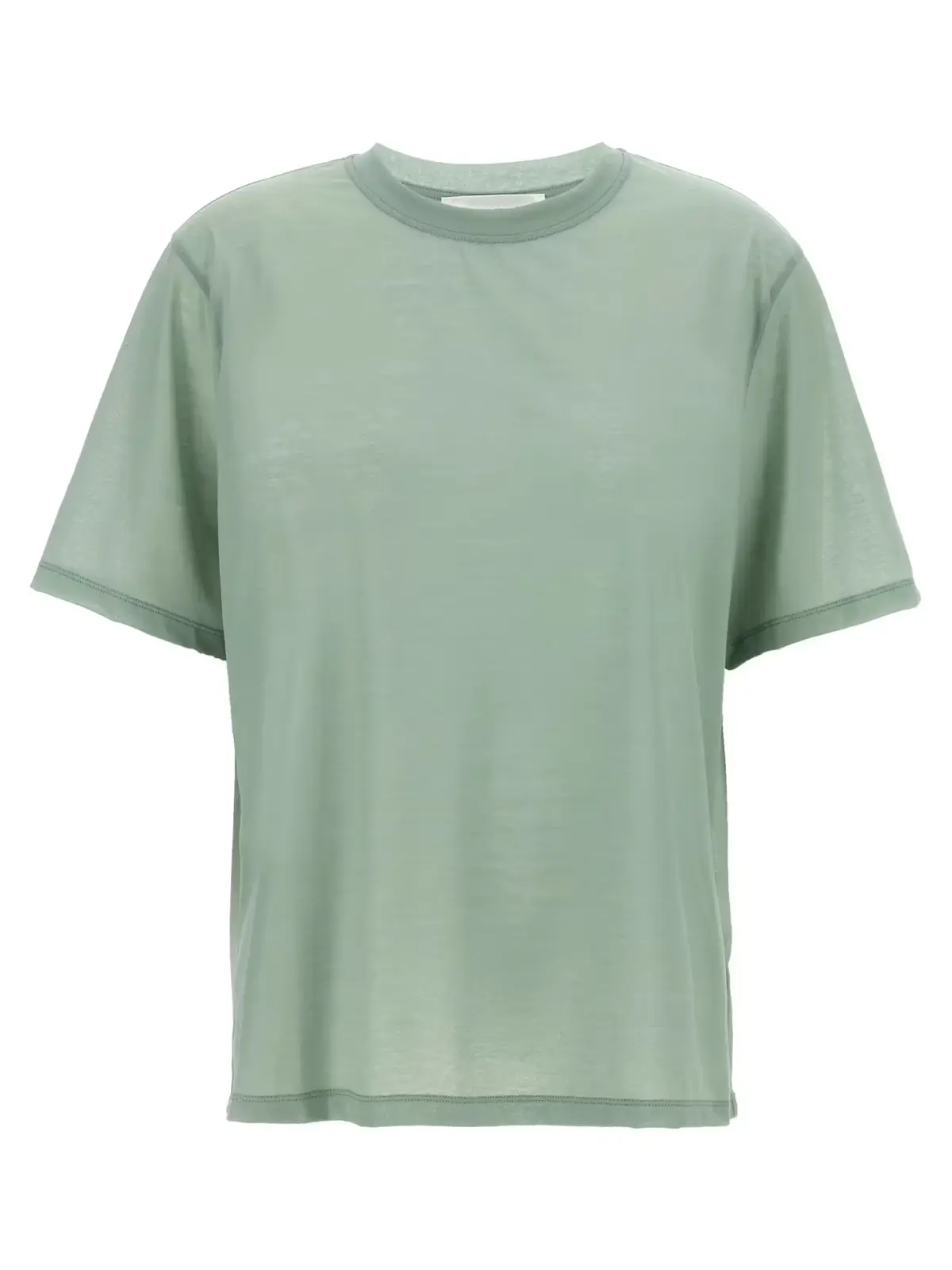 Ця жіноча футболка з напівпрозорої крепової бавовни поєднує вишуканість і комфорт, підкреслені витонченим вишитим логотипом на спині. Її зелений відтінок, класичний круглий виріз і злегка спущені плечі створюють неповторний стиль, що відображає статус і сучасну елегантність.
