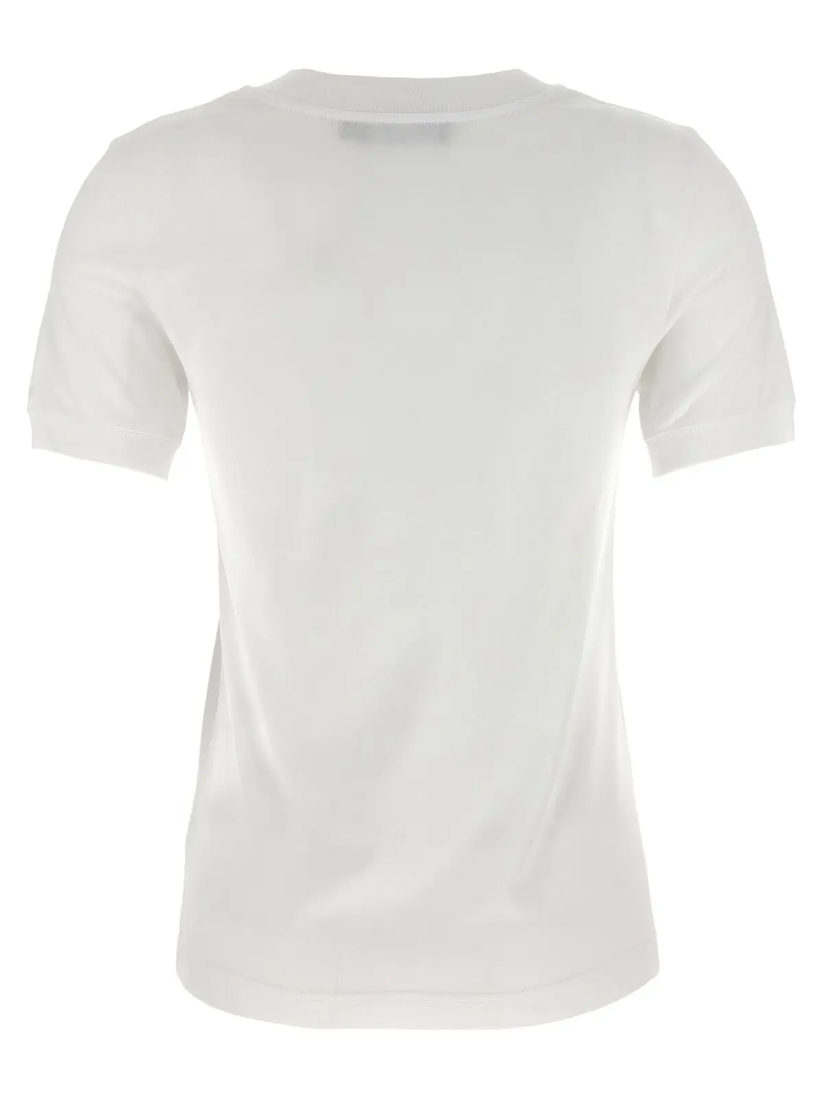 Вишукана жіноча футболка з легкої бавовняної джерсі, виконана в бездоганному білому кольорі з тонким вишитим логотипом. Елегантний круглий виріз і короткі рукави забезпечують комфорт і універсальність, підкреслюючи статус і витончений стиль сучасної модниці.