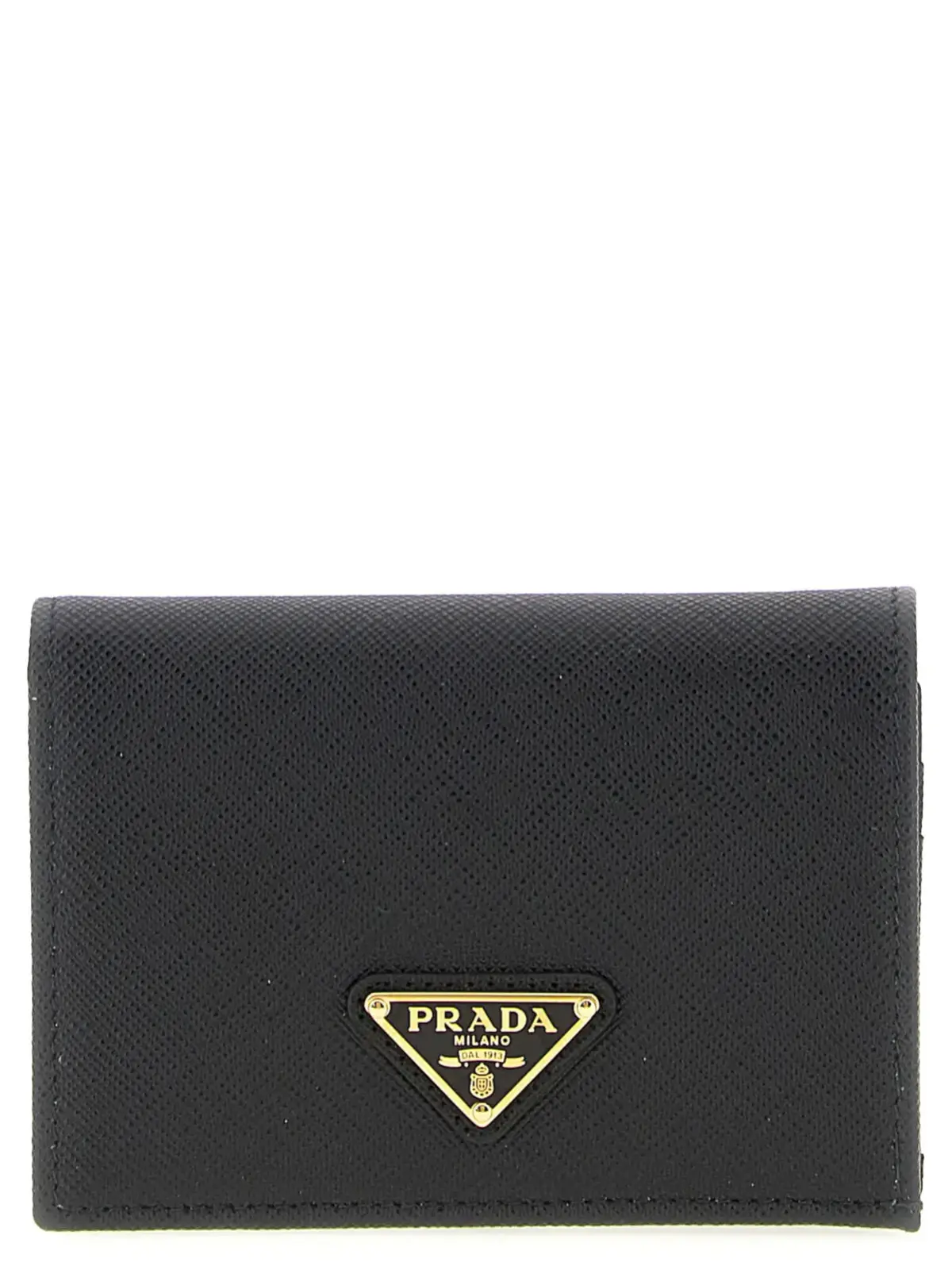 Чорний жіночий гаманець виготовлений з натуральної телячої шкіри Saffiano найвищої якості, що гарантує довговічність і вишукану текстуру. Елегантний дизайн з металевим емальованим логотипом у вигляді трикутника на передній частині підкреслює статус і стиль, а зручне застібання на кнопку забезпечує практичність і універсальність у використанні.
