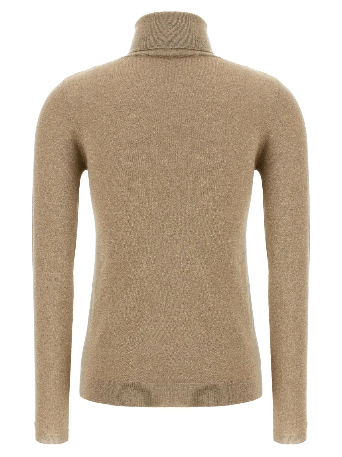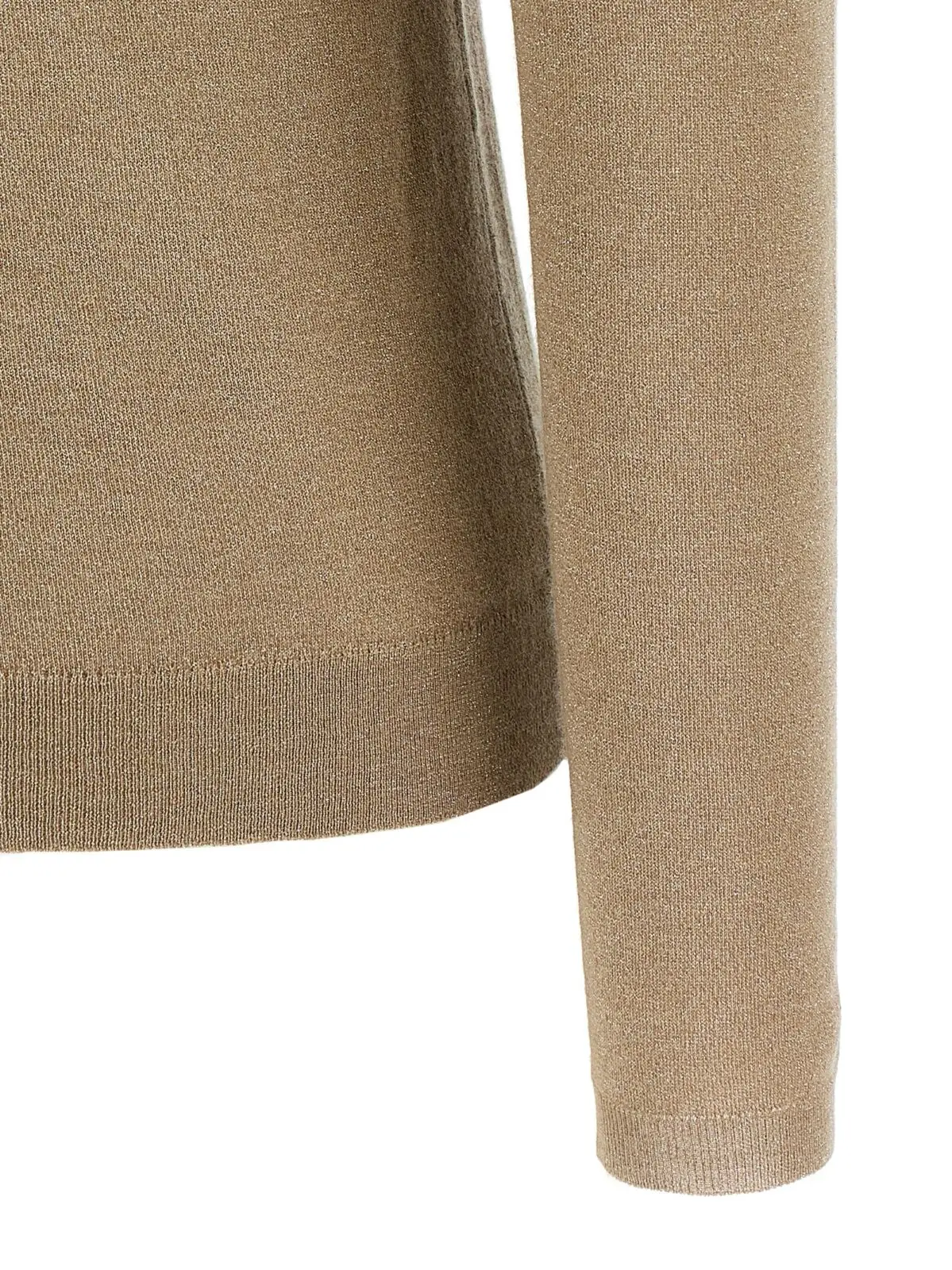Вишуканий гольф зі змішаного кашеміру та шовку з додаванням люрексу в золотистому відтінку поєднує в собі розкішну м’якість, елегантний дизайн з високим коміром та довгими манжетами, надаючи образу неповторний статус і універсальну витонченість для будь-яких подій.