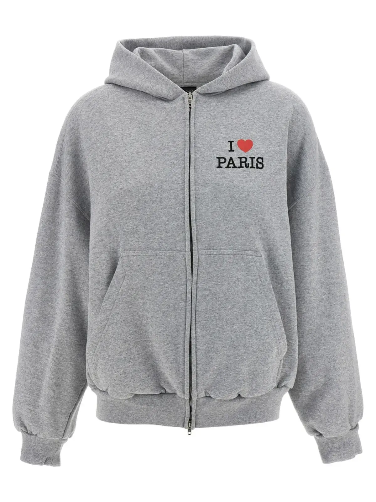 Жіноче худі з колекції Balenciaga виконане з м’якої 100% бавовни з ворсистою фактурою, поєднуючи комфорт і стиль. Елегантний сірий відтінок, принт I Love Paris & Balenciaga на передній та задній частинах, зручна блискавка, кишені, довгі рукави з манжетами та занижені плечі створюють універсальний образ високого статусу та сучасної моди.