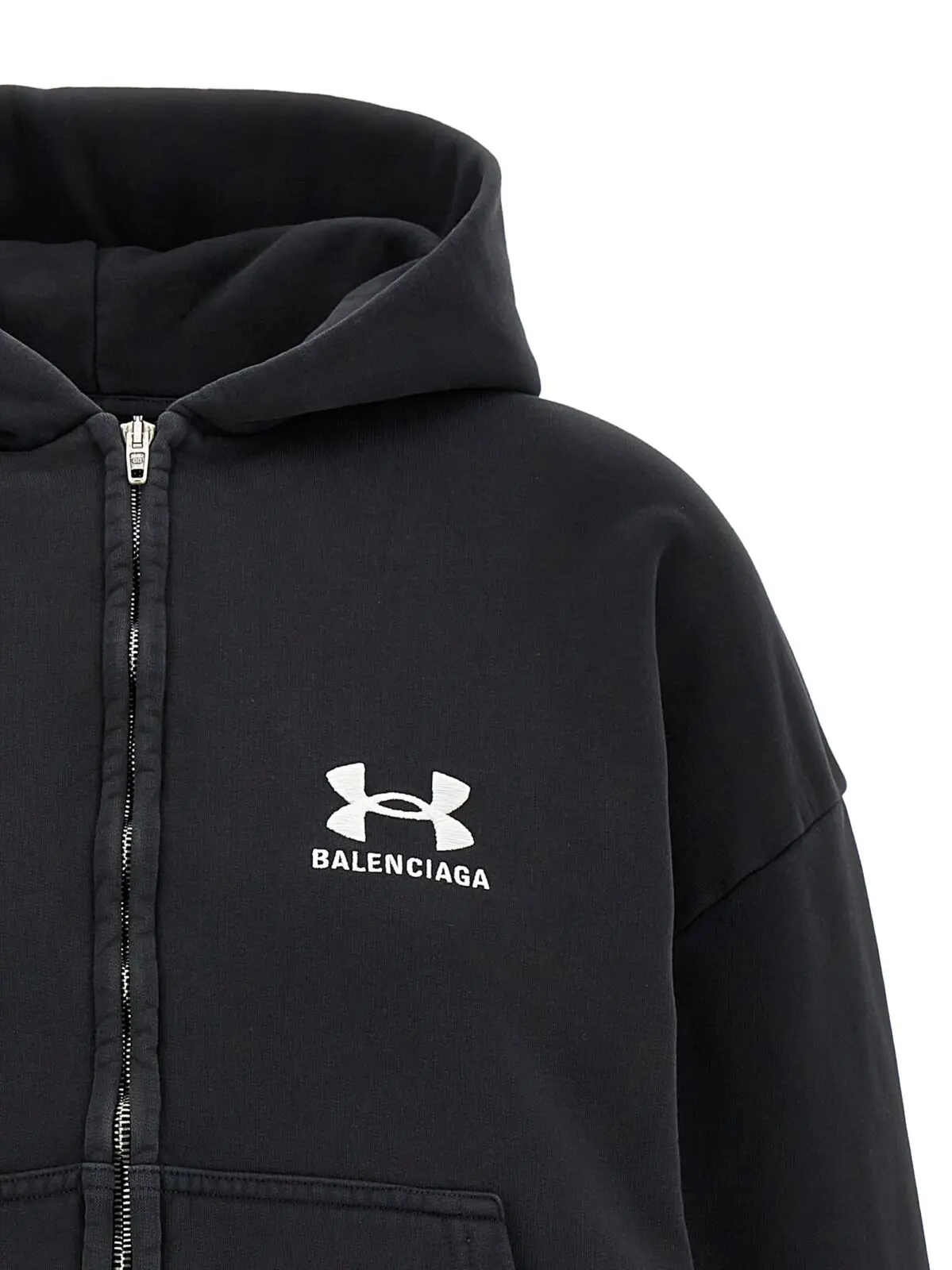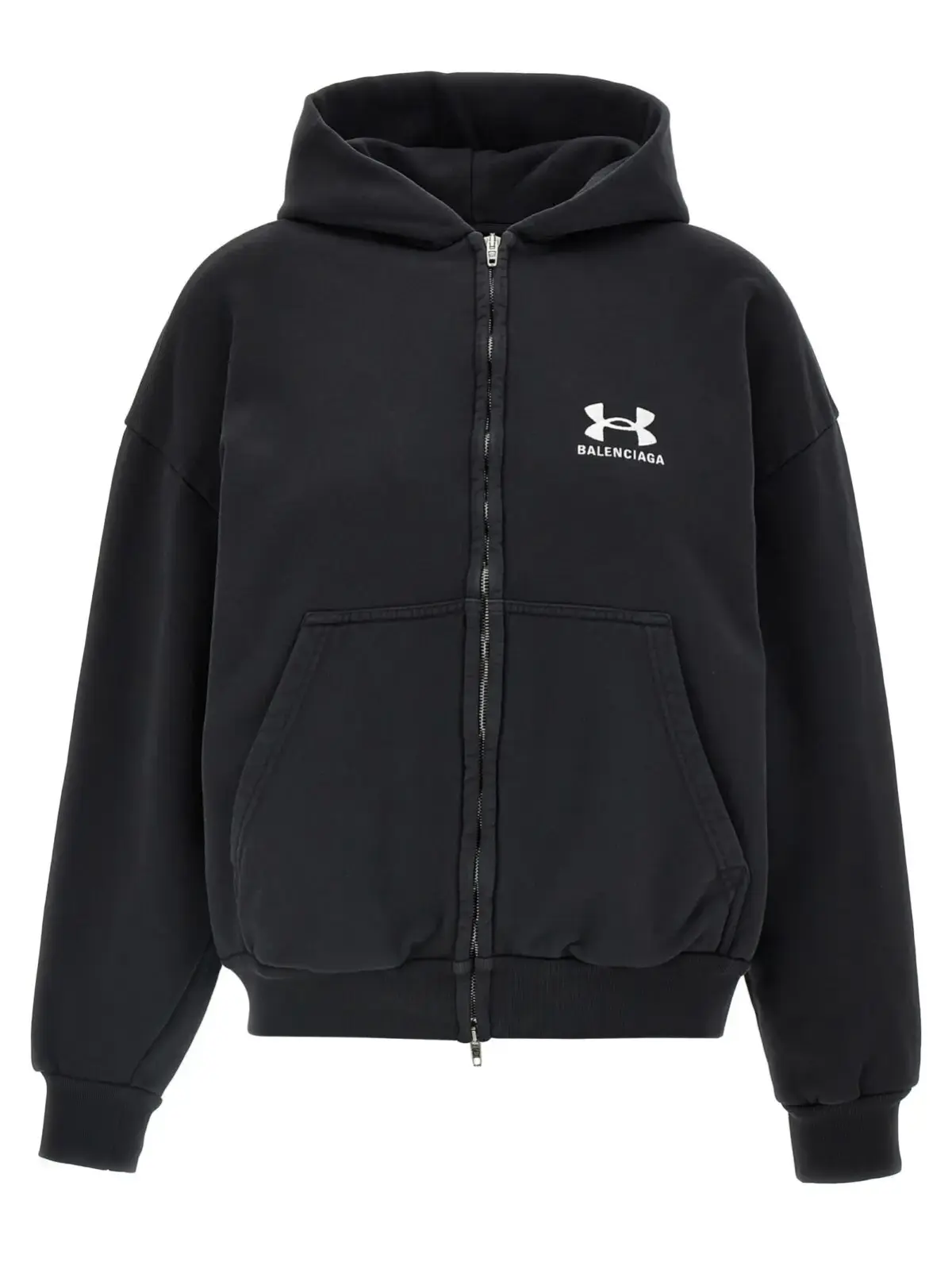 Худі Balenciaga x Under Armour в чорному кольорі поєднує інноваційний дизайн з бездоганною якістю. Виготовлене з 100% бавовни, це худі вражає м’якістю та комфортом. Логотипи на передній та задній частинах підкреслюють статус брендів, а зручні кишені та застібка на блискавці забезпечують функціональність в повсякденному житті. Довгі рукави з опущеними плечима додають елегантності та стилю, роблячи цю річ універсальним вибором для будь-якої події.