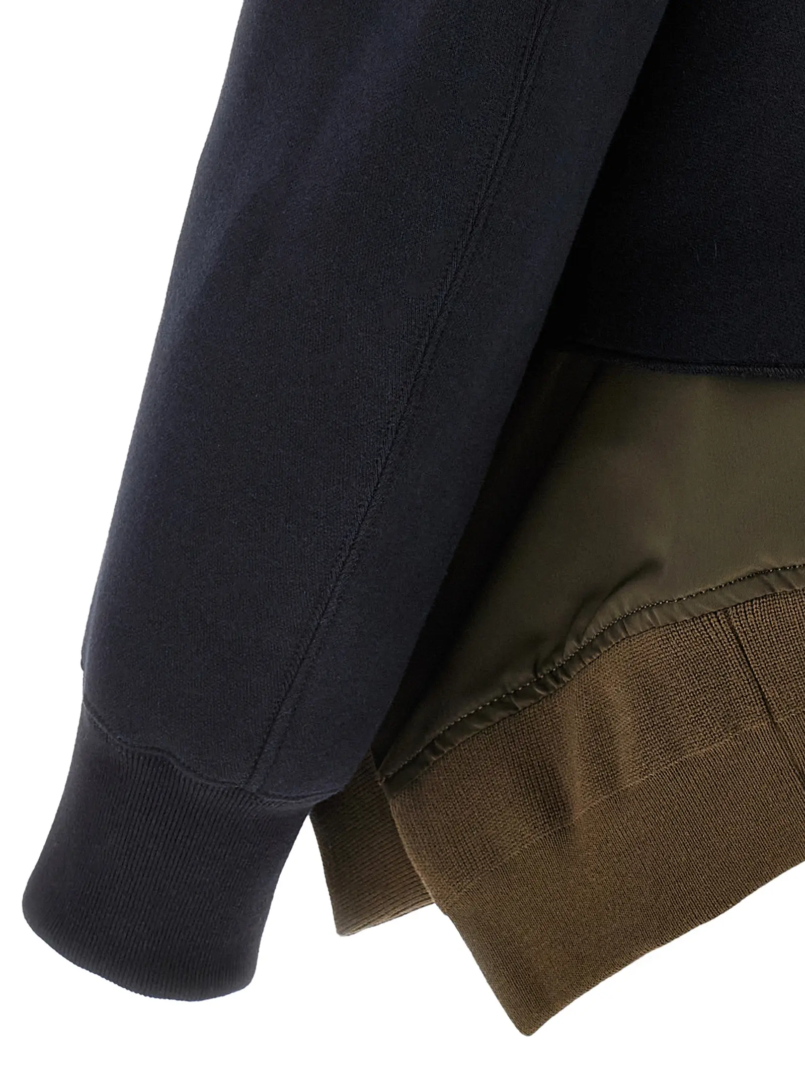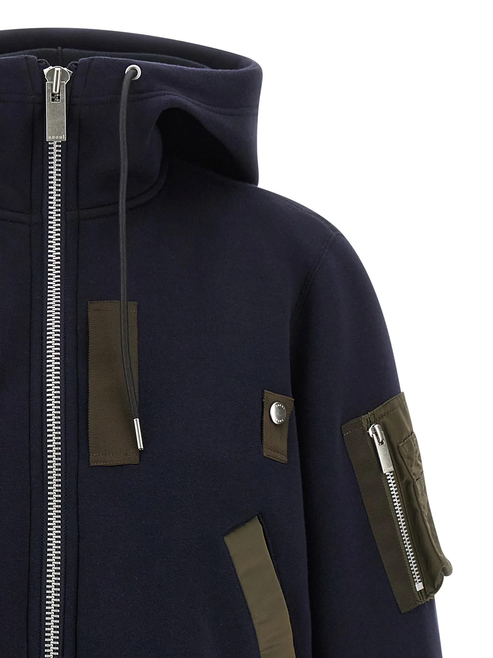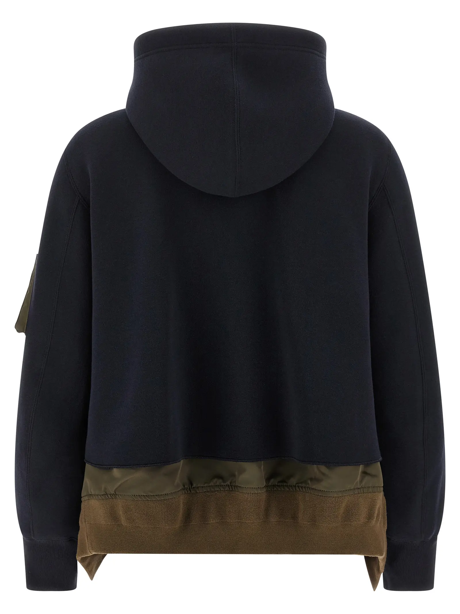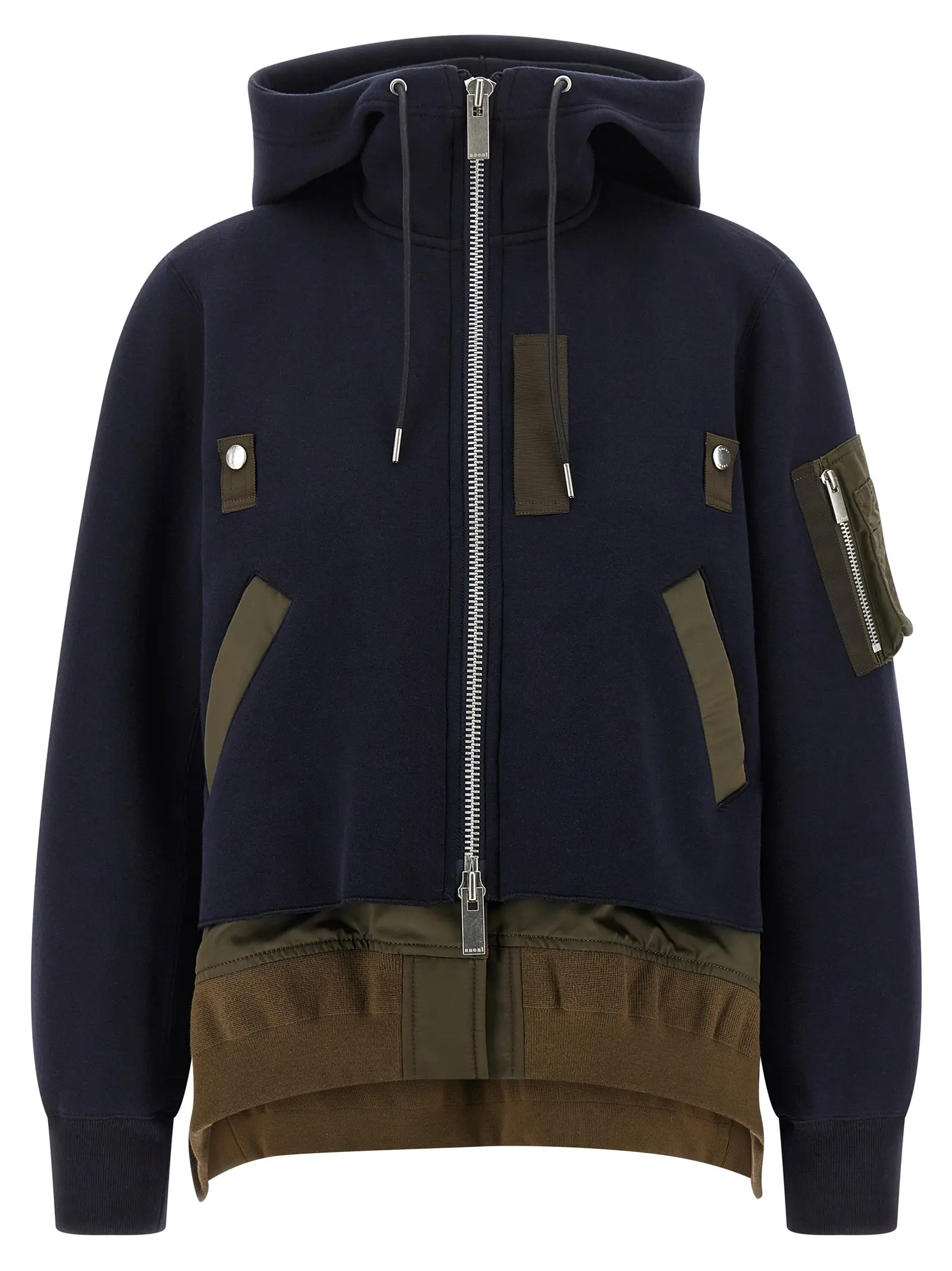 Двошаровий худі з матеріалу спонж. Зроблений з 62 відсотків бавовни та 38 відсотків поліестеру. Має передню застібку на блискавку. Оснащений кишенями. Має довгі рукави з манжетами. Низ асиметричний.