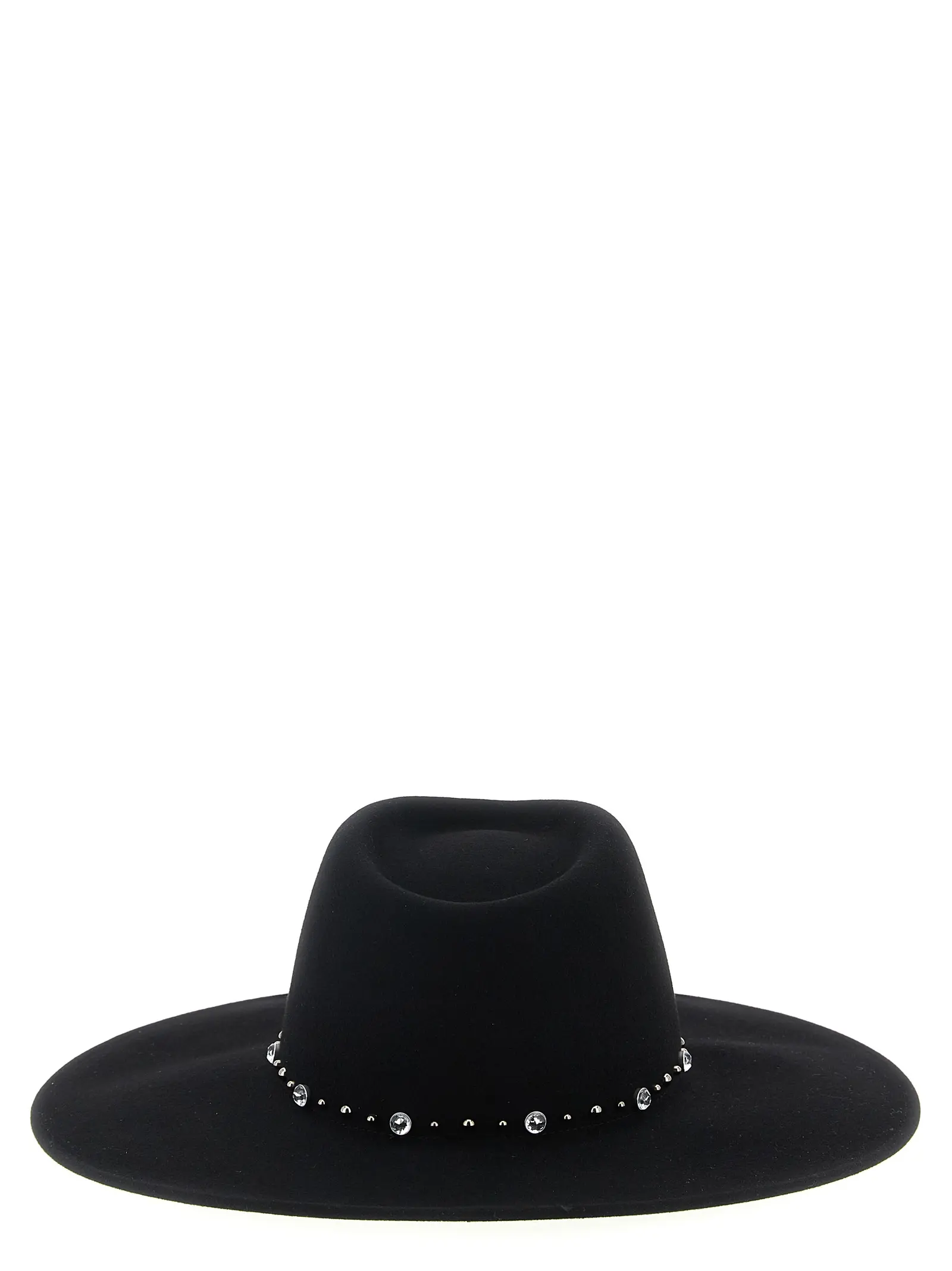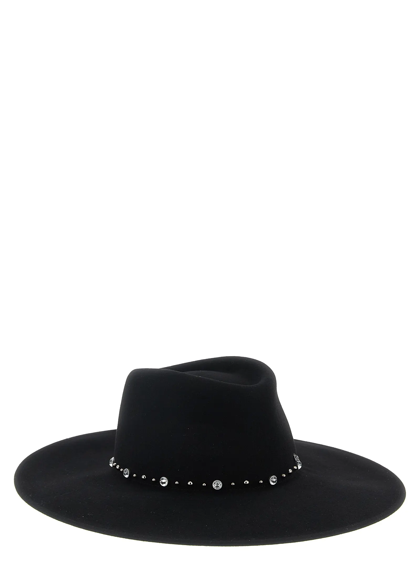 Чорний жіночий капелюх Roy від Maison Michel виготовлений з 100% вовни, поєднує витонченість широкого поля з вишуканими деталями зі стразів і заклепок, що підкреслюють інноваційний дизайн і бездоганну якість, надаючи образу вишуканого статусу й неповторного стилю.