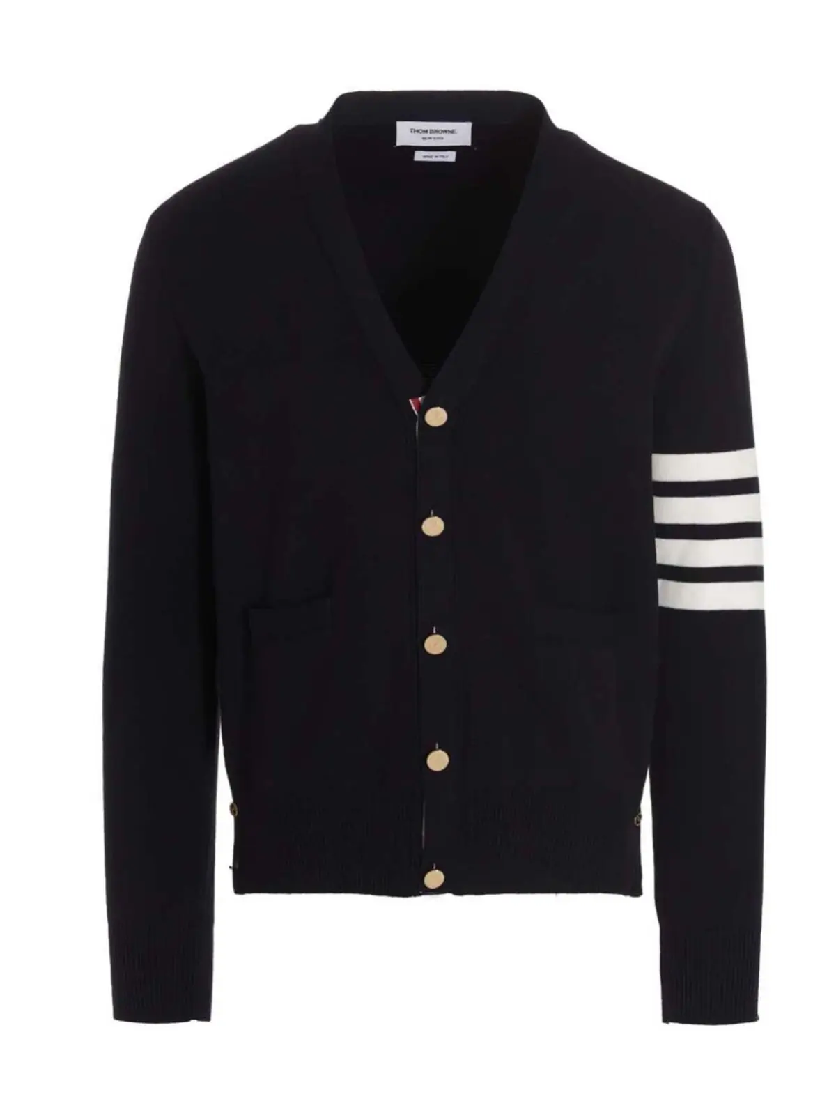 Вишуканий чоловічий кардиган 4 bar Thom Browne Синій з елегантним V-подібним коміром та ґудзиковим замком. Виготовлений із високоякісної 100% бавовни з характерною деталлю у вигляді чотирьох смуг. Довгі рукави та міланський шов додають неперевершеного стилю і комфорту. Ідеальний вибір для створення витонченого образу.