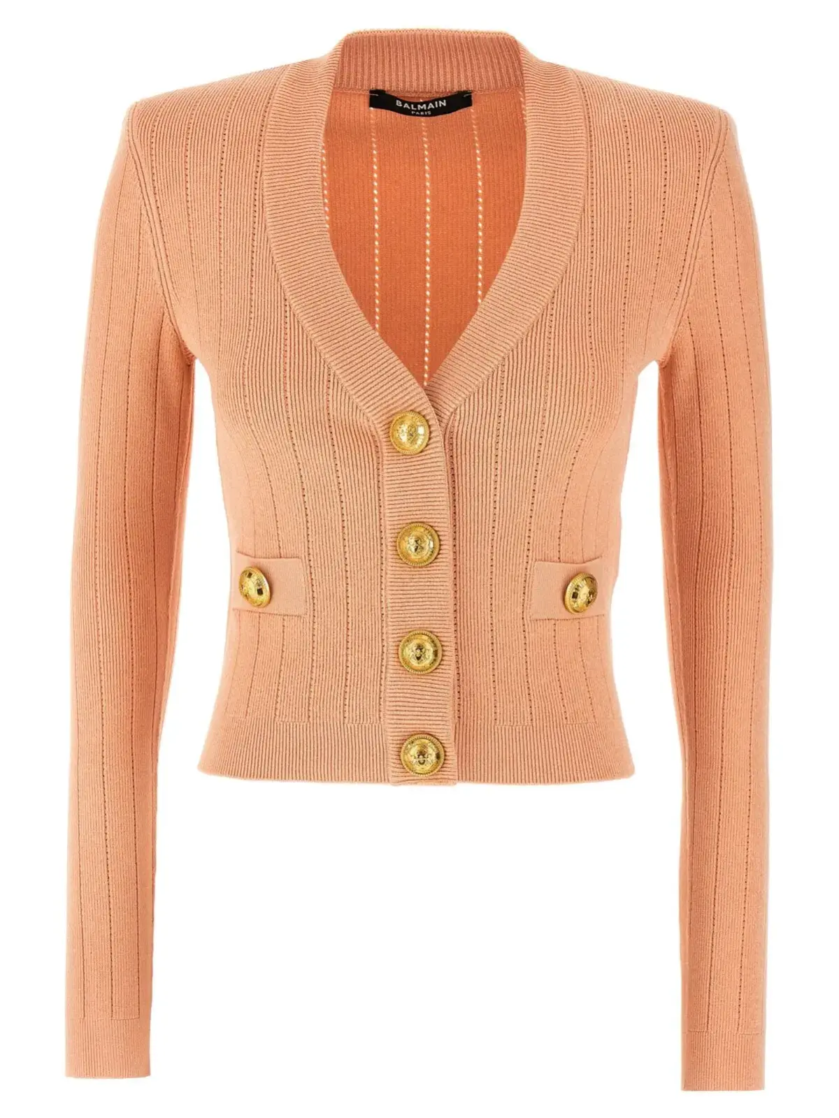 Кардиган Balmain Chiocciola в ніжному рожевому відтінку — це елегантний вибір для сучасної жінки. Виконаний з високоякісної суміші віскози та поліестеру, він відрізняється м’якістю та приємною текстурою. Золоті металеві ґудзики з логотипом Chiocciola додають розкоші, а приталений крій з підкладкою на плечах підкреслює силует. Цей кардиган ідеально впишеться в будь-який гардероб, надаючи образу статусності та витонченості.
