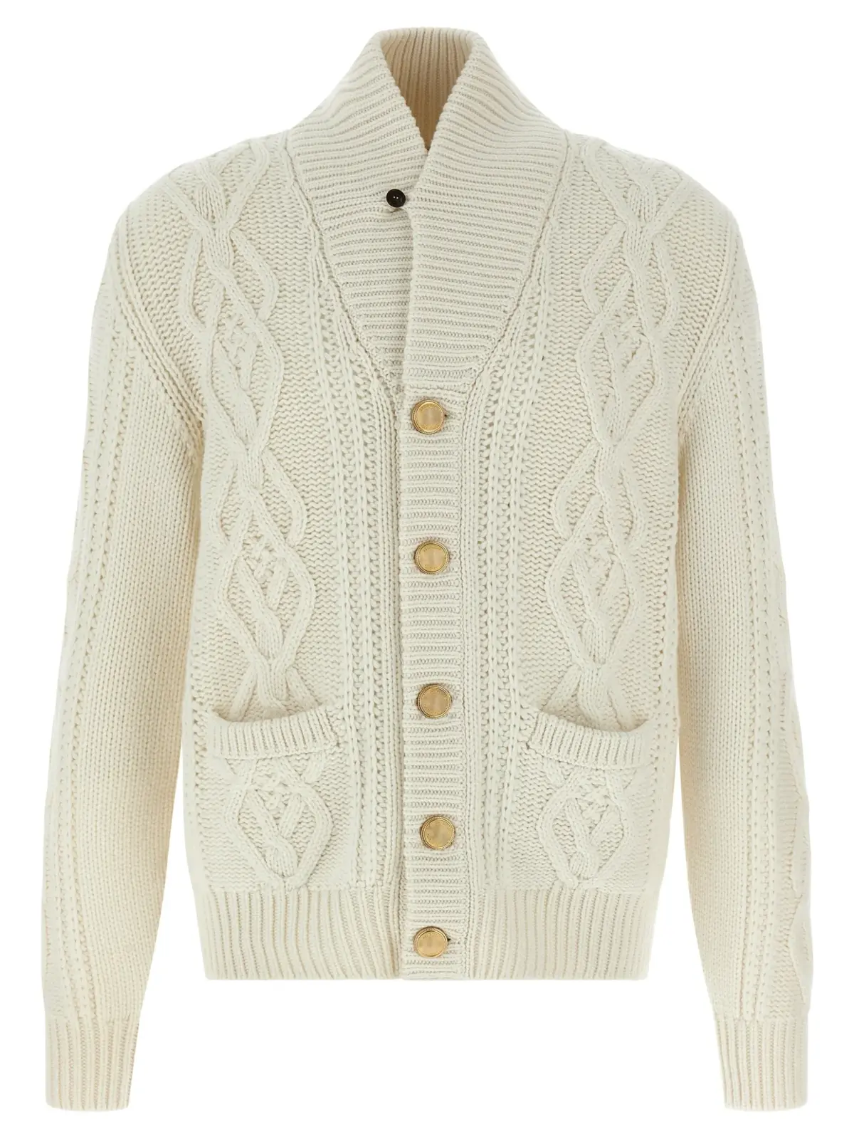 Вишуканий чоловічий кардиган з 100% кашеміру білого кольору, виконаний у благородній в’язці з аранами, оснащений круглим коміром з лацканами та передньою застібкою на золоті ґудзики з логотипом. Поєднує неперевершену якість, інноваційний дизайн і бездоганну універсальність, підкреслюючи статус і вишуканий стиль власника.