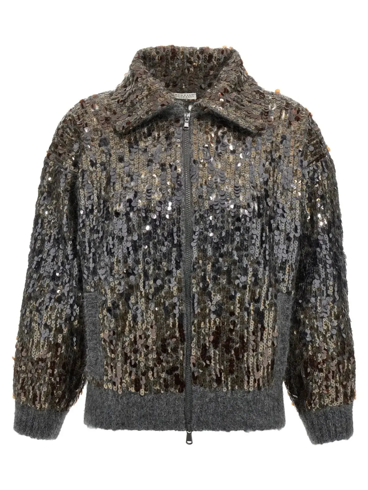 Вишуканий кардиган із мохерової та вовняної пряжі з елегантною аплікацією з паєток, що створює неповторний ефект деграде. Модель із коміром сорочкового типу, застібкою на блискавку, кишенями та довгими рукавами з манжетами поєднує в собі інноваційність, комфорт і вишуканий стиль, підкреслюючи статус і витонченість власниці.