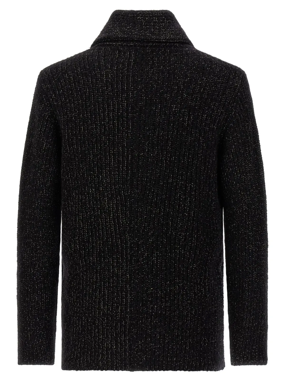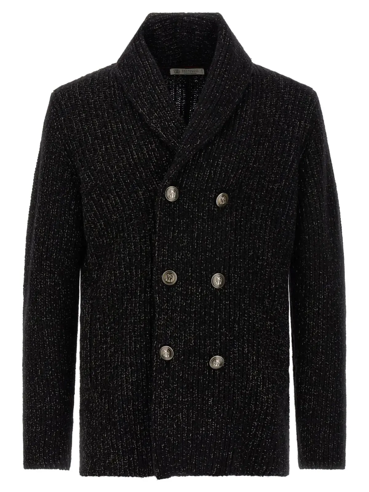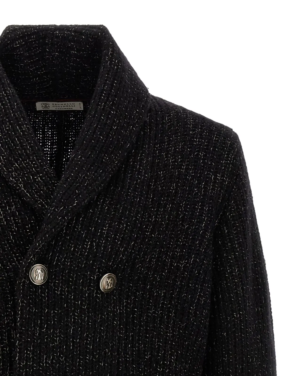 Вишуканий двобортний кардиган чорного кольору, виконаний з розкішної суміші кашеміру, шовку та вовни, поєднує неперевершену м’якість із сучасним англійським дизайном. Елегантний комір, металеві ґудзики та практичні кишені підкреслюють вишуканий стиль і функціональність, створюючи образ статусу та бездоганного смаку.