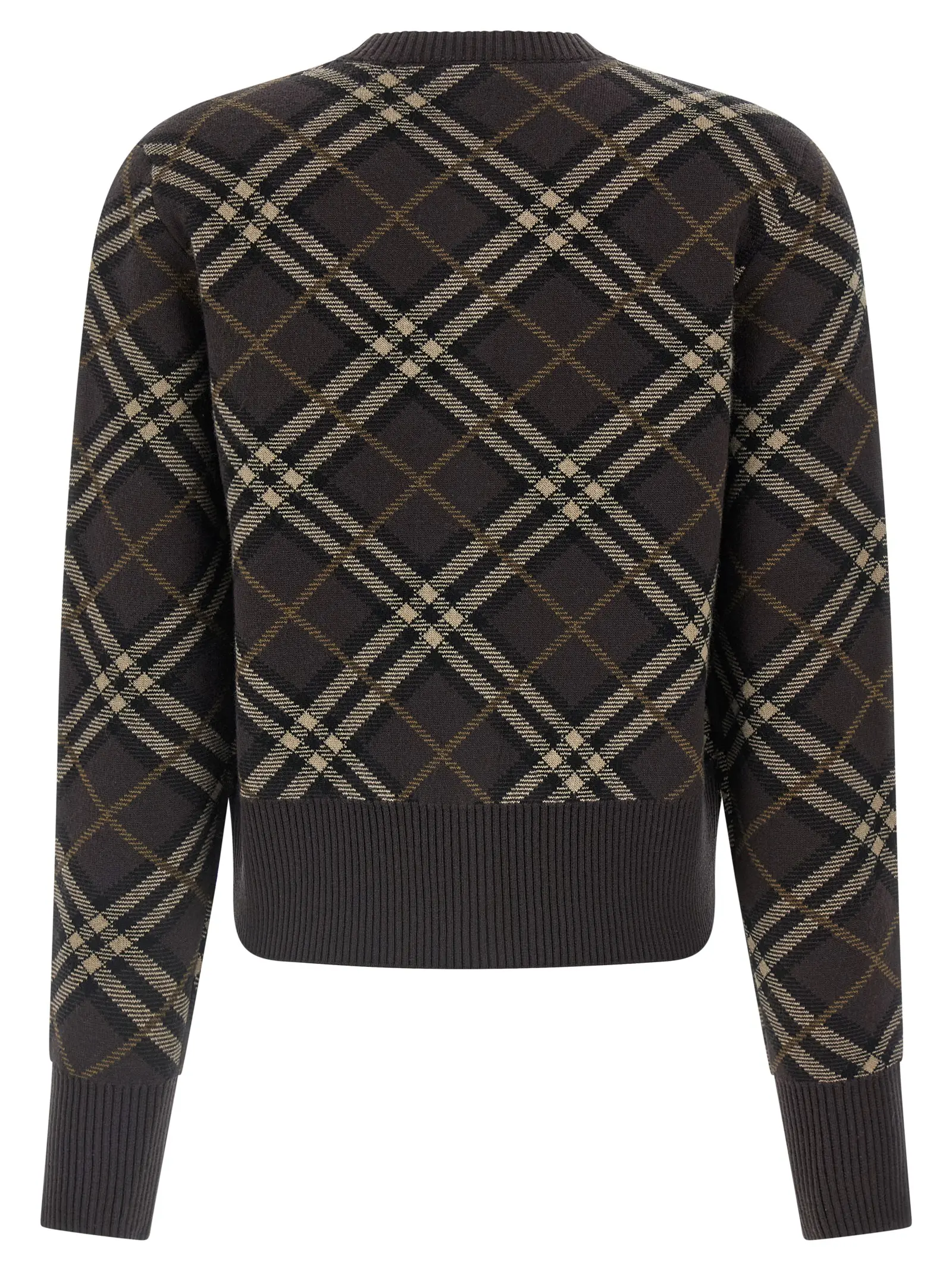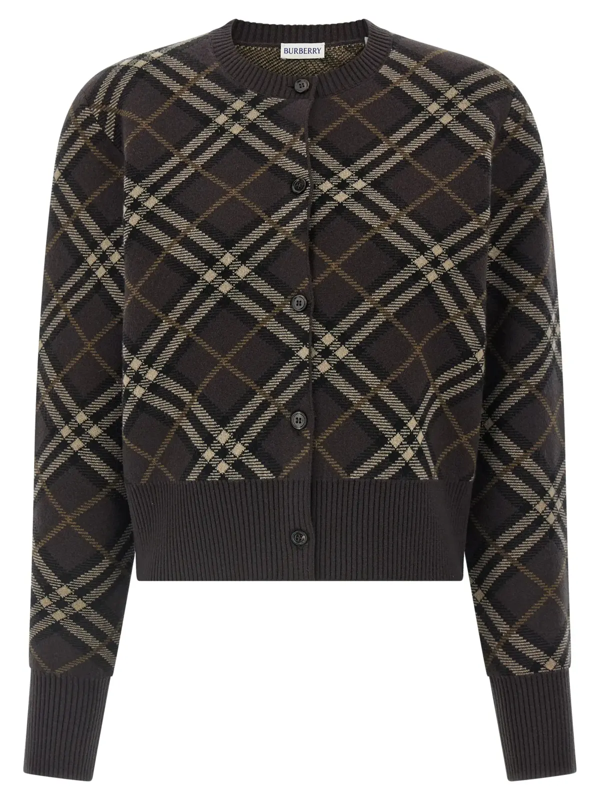 Вишуканий жіночий кардиган із подвійної вовни та кашеміру, виконаний у коричневому відтінку з жакардовим візерунком Burberry, поєднує в собі неперевершену якість і комфорт. Елегантний дизайн із круглим вирізом, довгими рукавами з манжетами та класичною застібкою підкреслює статус і універсальність образу, створюючи витончену гармонію стилю та інноваційності.