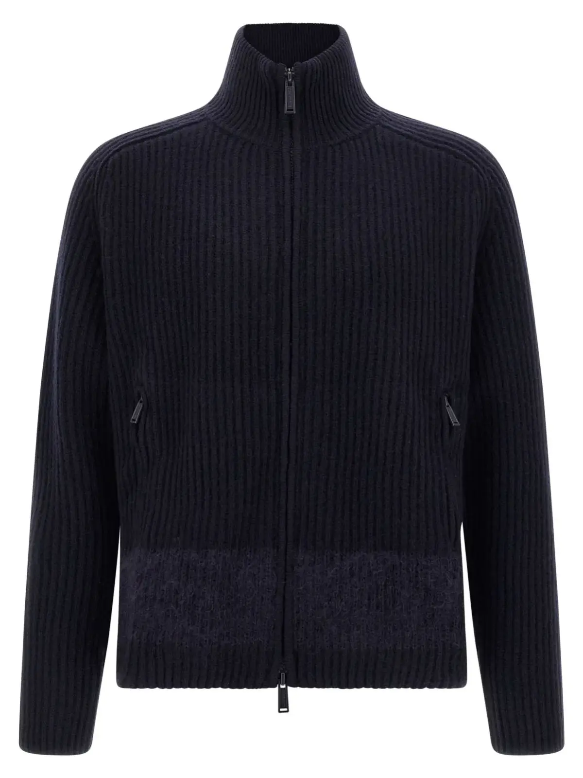 Вишуканий чоловічий кардиган синього відтінку виготовлений із високоякісної вовни з тонованими вовняними вставками, що забезпечують неперевершений комфорт і тепло. Елегантний дизайн з високим коміром, передньою застібкою на блискавку та практичними кишенями поєднує стиль і функціональність, підкреслюючи статус і витонченість свого власника.