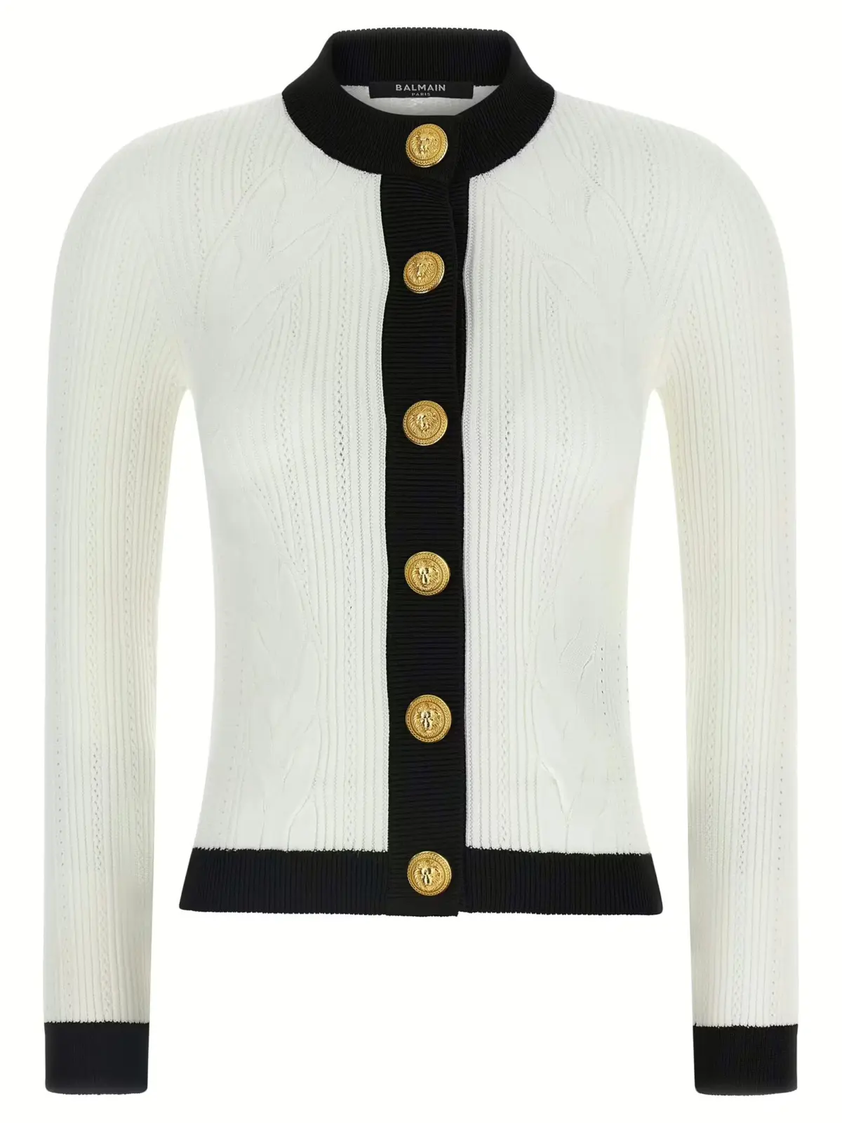 Двокольоровий кардиган із розтяжної віскози з додаванням поліестеру поєднує в собі вишуканий дизайн із комфортом завдяки витонченому плетінню та декоративним металевим ґудзикам. Елегантний силует із круглим вирізом і довгими рукавами підкреслює статус і універсальність, створюючи бездоганний образ преміум-класу.