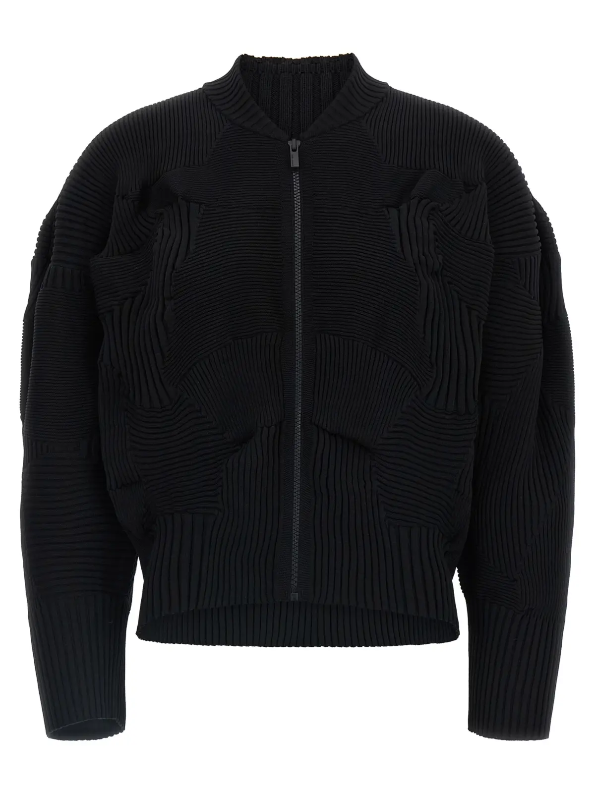 Чорний жіночий кардиган виконаний із плісированої тканини в стилі пэчворк із довгими рукавами на манжетах та застібкою-блискавкою спереду. Виготовлений із високоякісного переробленого поліестеру, він поєднує інноваційність, екологічність і універсальність, підкреслюючи вишуканий стиль і статус власниці.