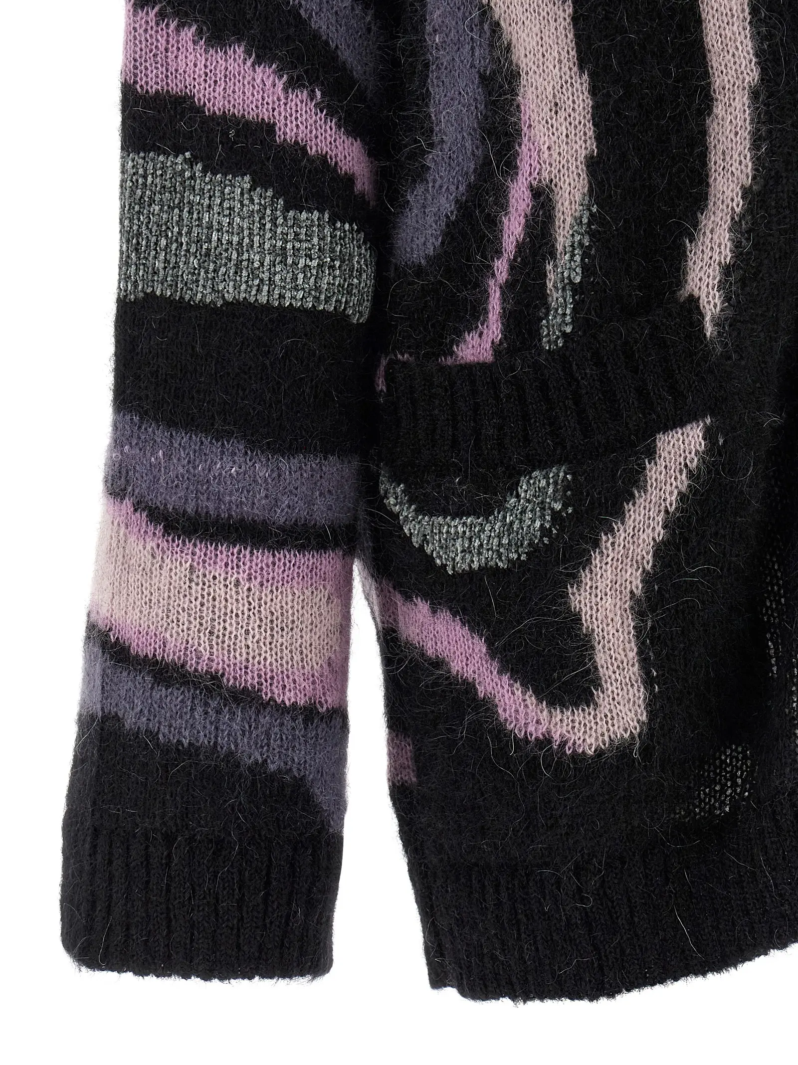 Кардиган з мохерової вовни з віскозою та вовною. Виріб має V-подібний виріз горловини. Спереду застібається на гудзики. Оснащений кишенями. Довгі рукави з манжетами та заниженою лінією плечей. Матеріал складається з 67% мохерової вовни, 27% поліаміду, 6% віскози та 5% вовни. Принт розташовується унікально на кожному виробі. Можливі відмінності між зображенням та отриманим товаром.