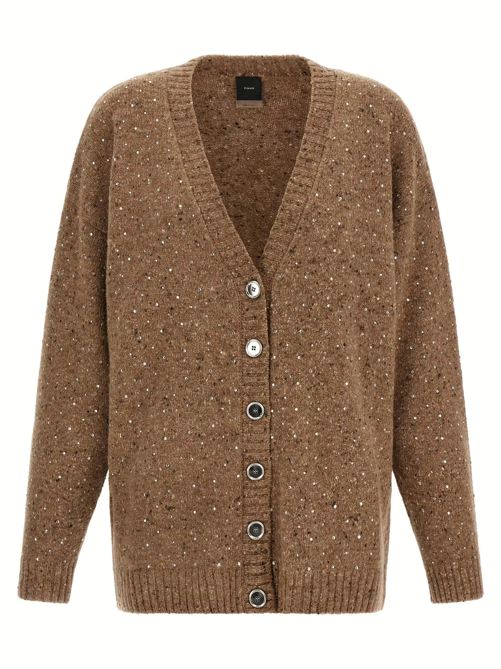 Ідеально поєднуючи вишуканість і комфорт, цей бежевий кардиган із букле з високоякісної вовни з додаванням поліаміду та віскози прикрашений елегантними стразами по всій поверхні. Витончений дизайн із V-подібним вирізом і застібкою на ґудзики підкреслює статус і створює універсальний образ для будь-яких вишуканих подій.