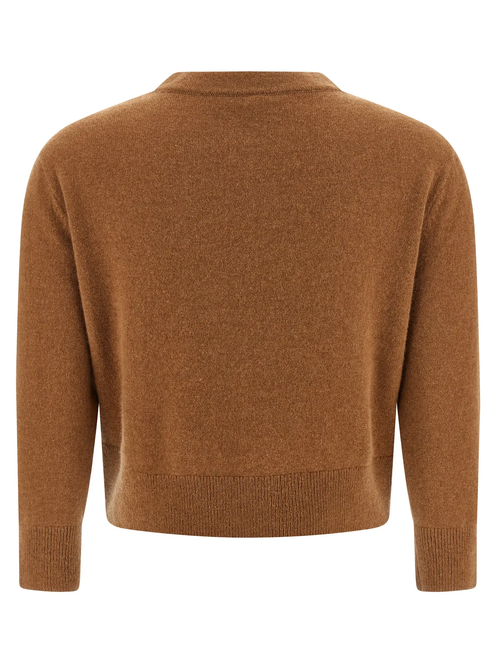 Вишуканий жіночий кардиган з 100% кашеміру у коричневому відтінку поєднує в собі інноваційний кроп-дизайн із витонченим вузлом спереду, V-подібним вирізом та елегантними рукавами три чверті, підкреслюючи статус і бездоганний стиль у будь-якій ситуації.