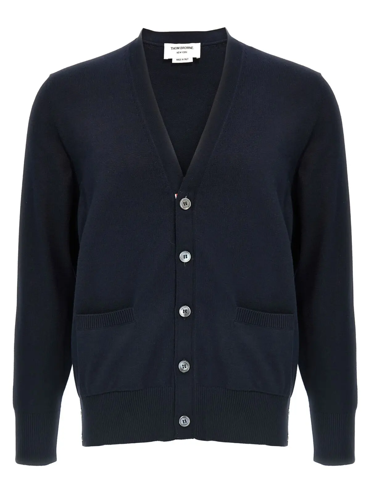 Цей кардиган Thom Browne 4-Bar у вишуканому синьому кольорі стане ідеальним доповненням до вашого гардеробу. Виготовлений з 100% бавовни, він забезпечує максимальний комфорт та дихаючість. Вишуканий V-подібний виріз, кнопкова застібка, деталі 4-Bar збоку та елегантні кишені підкреслюють його стильний дизайн. Довгі рукави з манжетами та бічні розрізи з кнопками додають функціональності. Цей кардиган відображає статус та індивідуальність, пропонуючи універсальність для будь-якої нагоди.