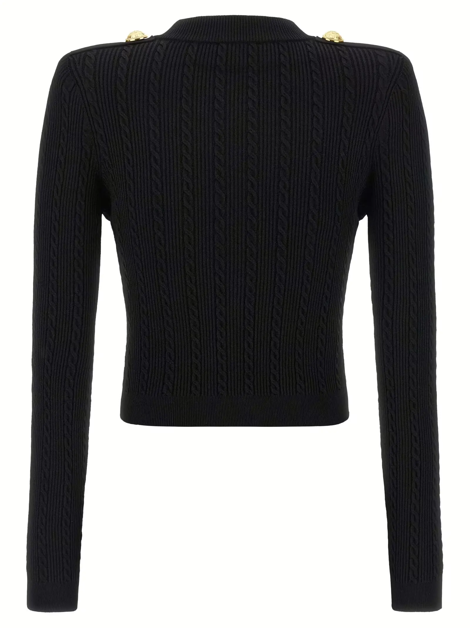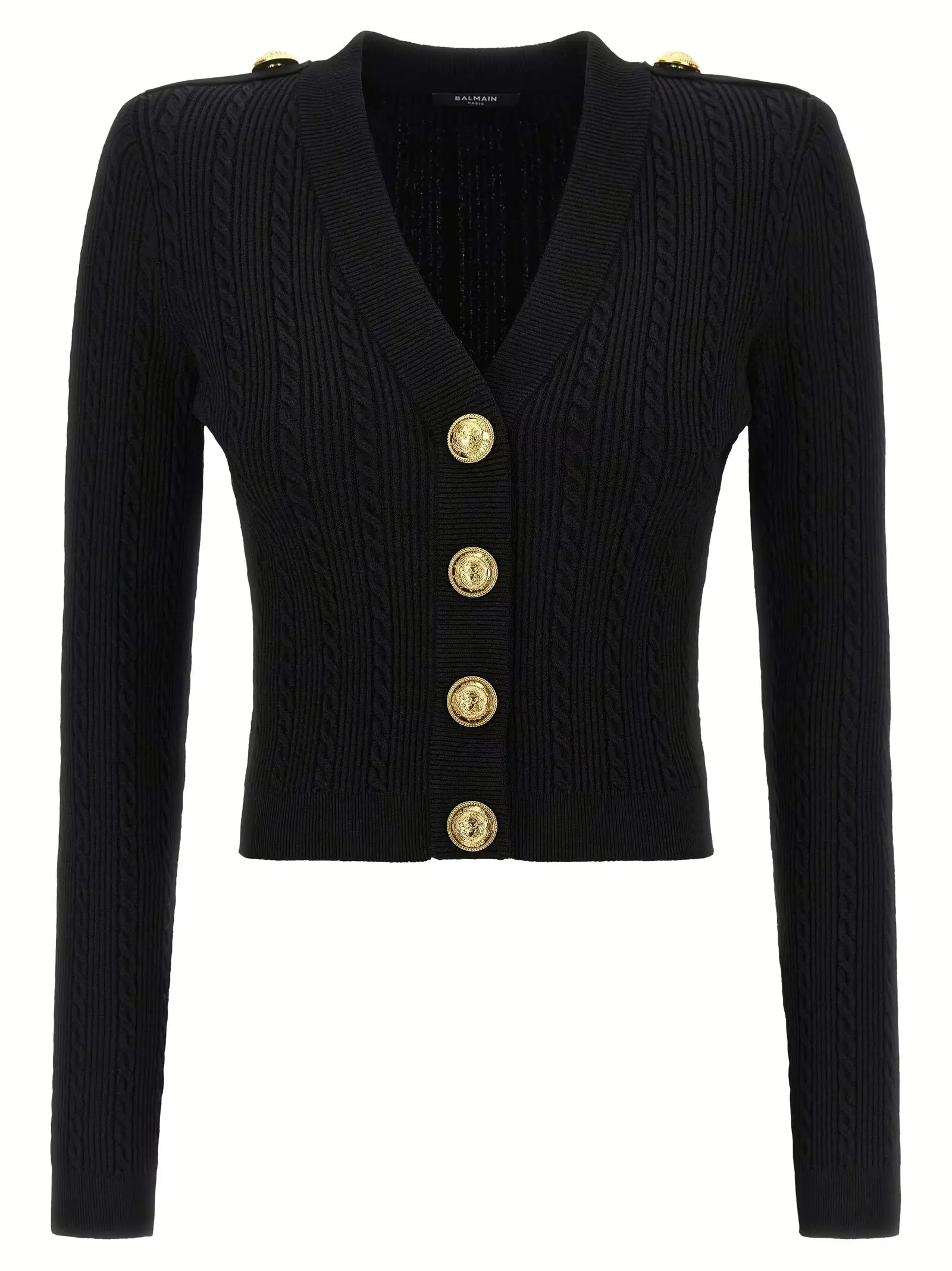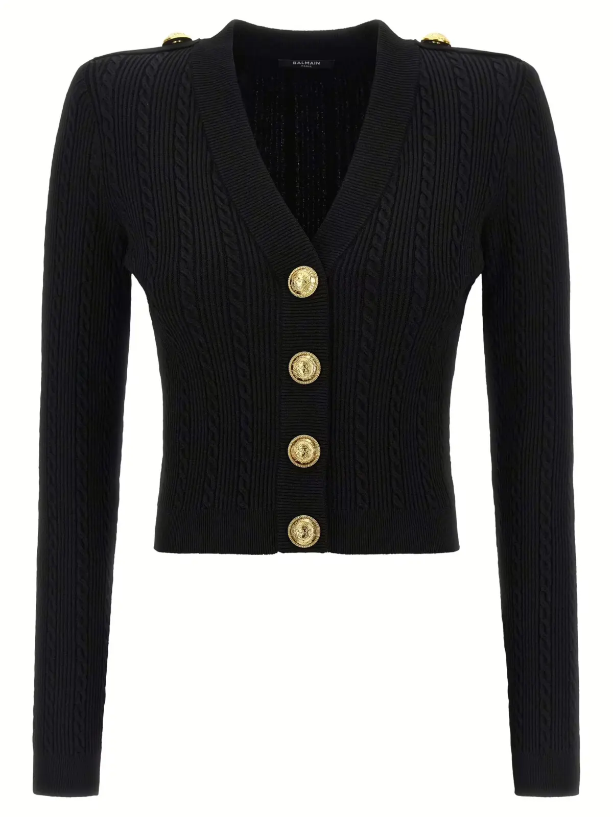 Вишуканий чорний кардиган виготовлений з високоякісної суміші віскози та поліестеру, поєднує в собі рельєфну в’язку, витончені плечові вставки з декоративними ґудзиками та вишуканий V-подібний виріз. Універсальний і стильний аксесуар, який підкреслює статус і додає шарму будь-якому образу.
