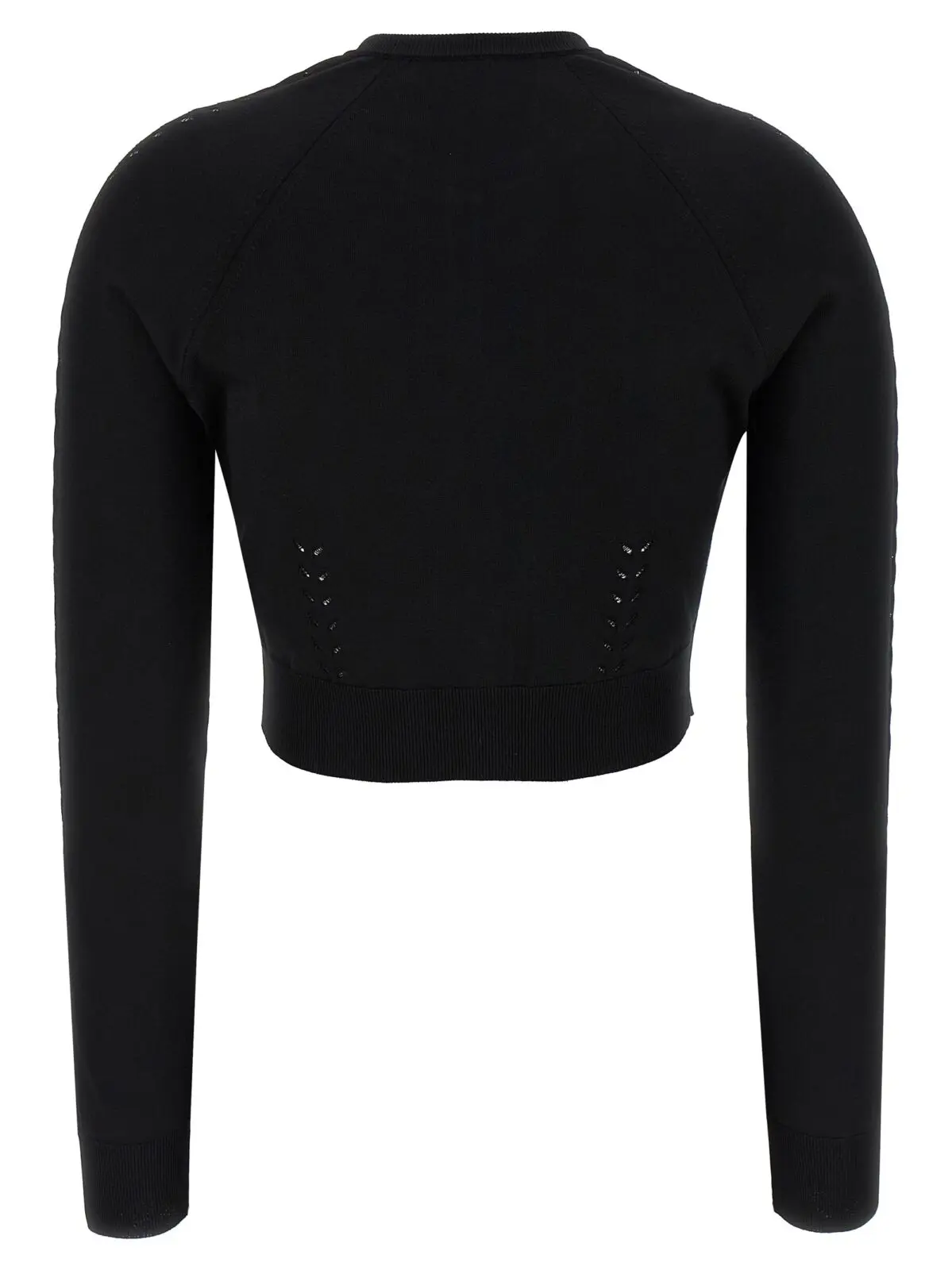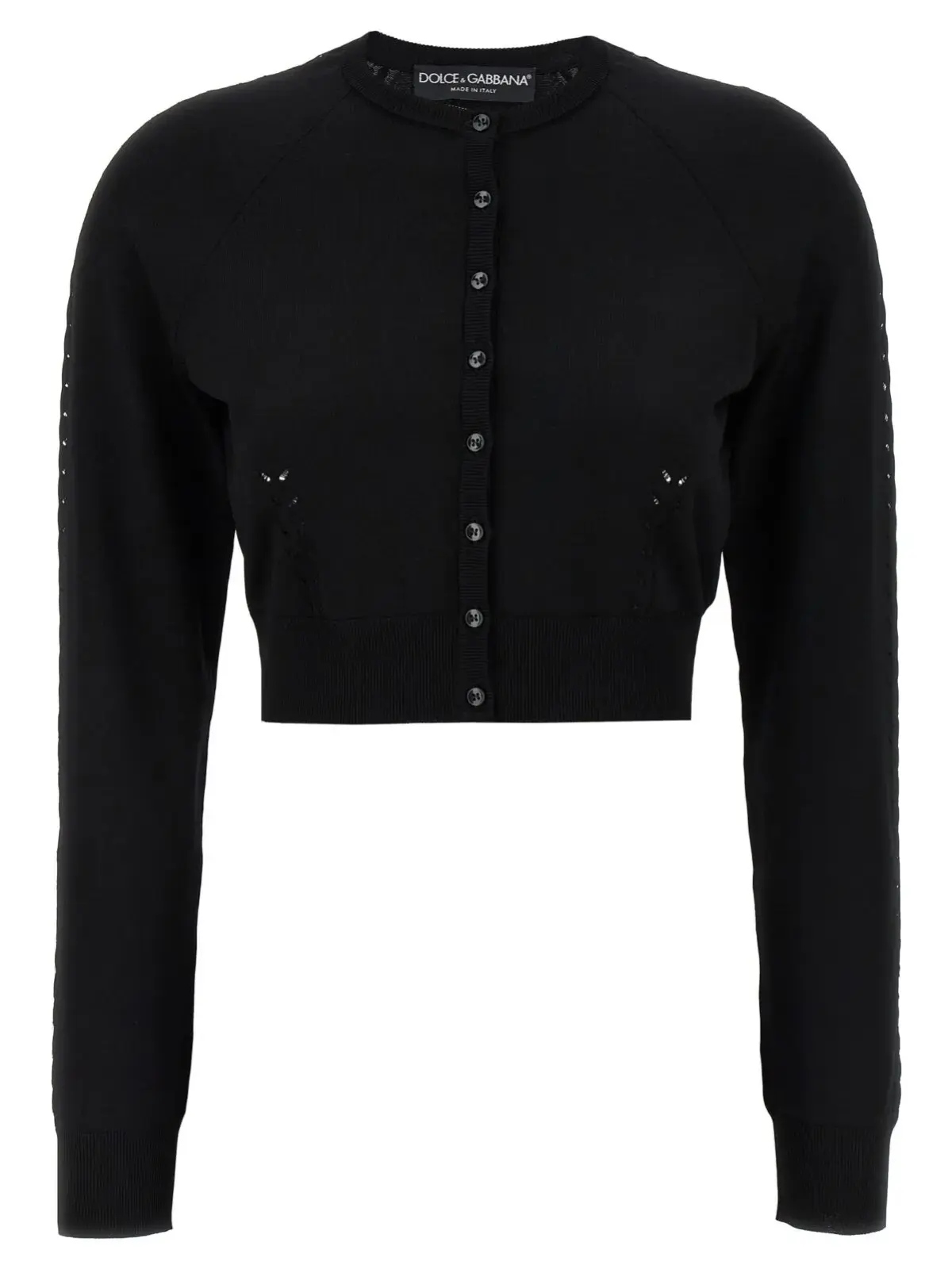 Чорний кардиган з віскози від Dolce Gabbana поєднує в собі вишуканий дизайн із комфортом завдяки високоякісним матеріалам: 79% віскоза, 13% поліамід, 8% поліестер. Кроп-модель із круглим вирізом, довгими рукавами та елегантними манжетами підкреслює стиль і статус, забезпечуючи універсальність для будь-яких образів.