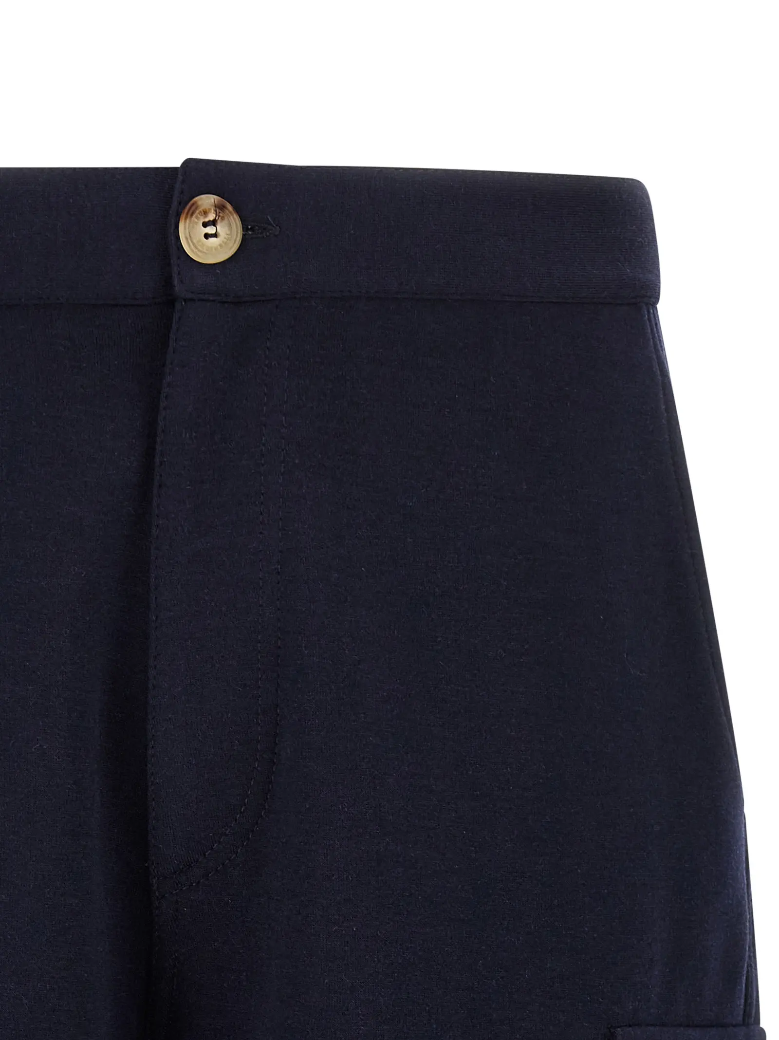 Бічні накладні кишені, куліска на талії, застібка на блискавку та ґудзик. Склад із 65% бавовни, 24% поліаміду, 7% кашеміру та 4% шовку. Прямий силует із середньою посадкою.