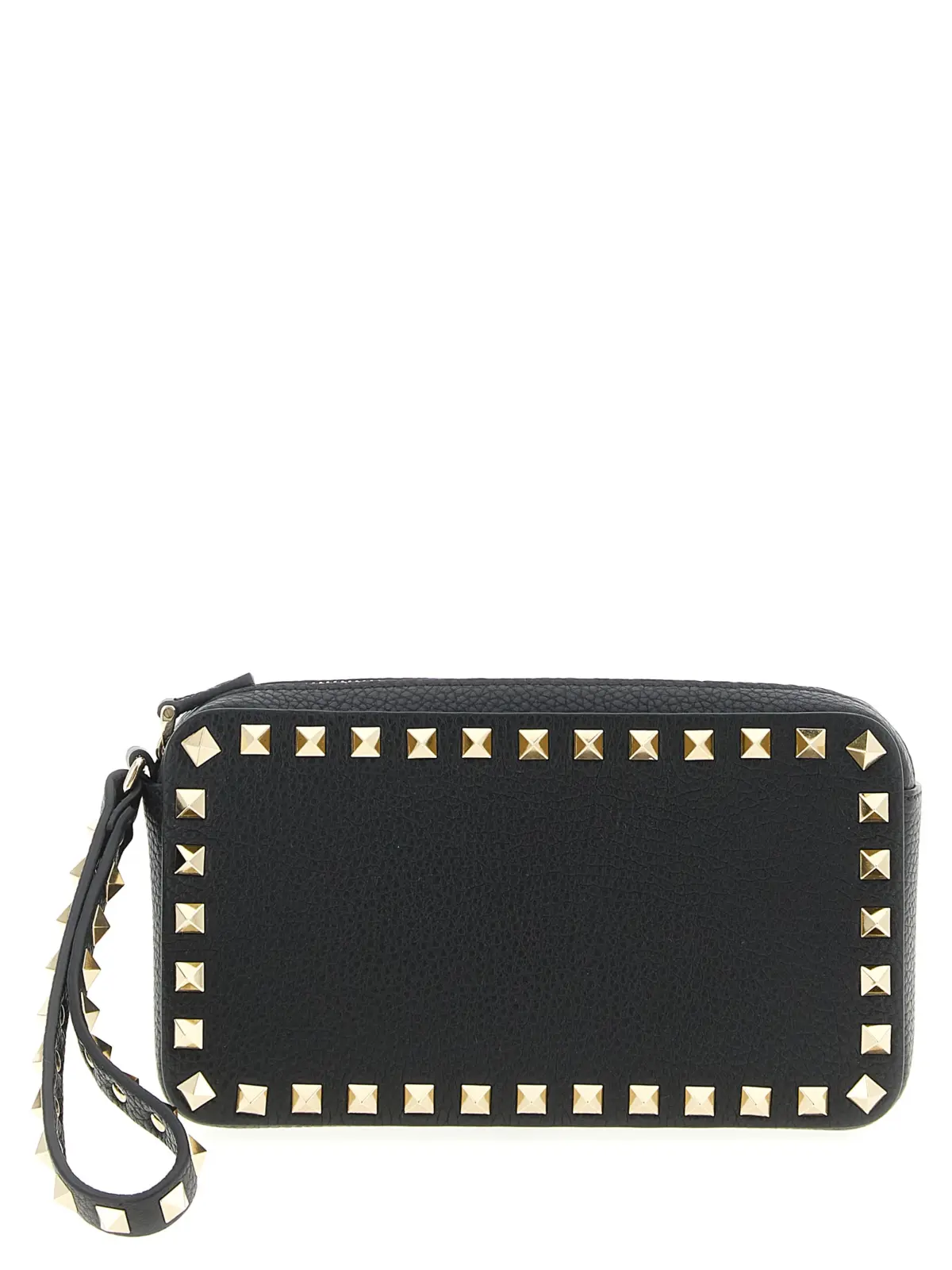 Елегантний жіночий клатч із колекції Rockstud від Valentino Garavani виконаний із високоякісної телячої шкіри чорного кольору, оздоблений вишуканими металевими заклепками, що надають виробу сучасного характеру. Верхня застібка на блискавку забезпечує надійність, а зручна ручка для носіння на зап’ясті додає функціональності, поєднуючи стиль і практичність для впевнених у собі поціновувачок преміум-моди.