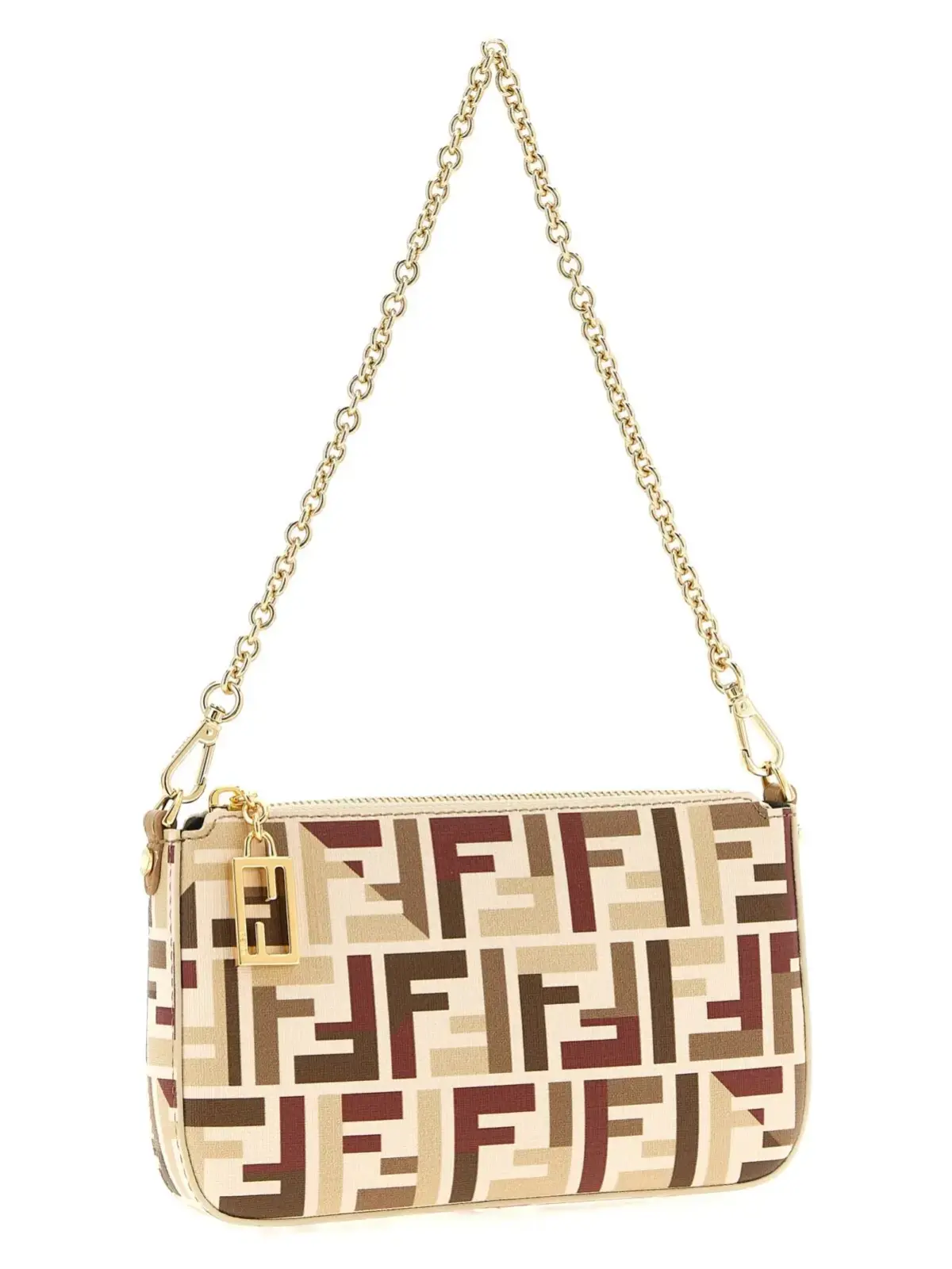 Елегантна косметичка Fendi Baguette виготовлена з високоякісних матеріалів, що поєднують поліуретан, поліамід, бавовну та поліестер. Відзначається витонченим багатокольоровим дизайном з легендарним візерунком FF, оснащена верхньою застібкою на блискавку, знімним ланцюжком та регульованим шкіряним ремінцем, що забезпечує максимальну функціональність і статусний стиль.
