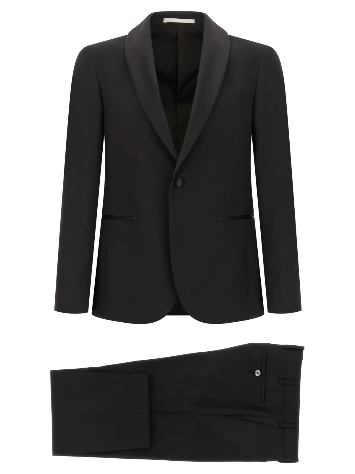 Чорний костюм з колекції Linea Cerimonia виготовлений із 100% високоякісної вовни, поєднуючи однобортний піджак із шалевим коміром та штани зі стрілками для бездоганного силуету. Елегантні сатинові деталі і віскозна підкладка забезпечують комфорт та вишуканість, створюючи універсальний образ статусу і стилю для сучасного чоловіка.