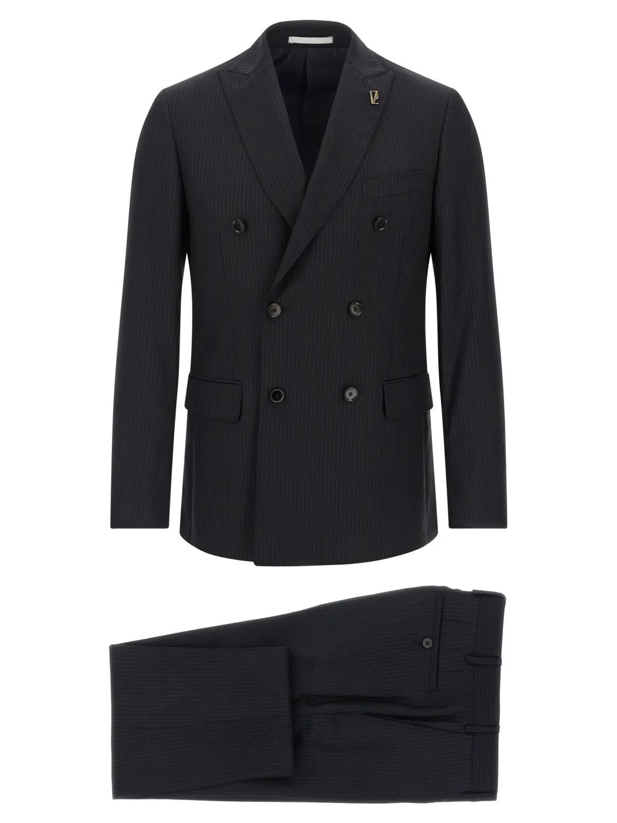 Вишуканий чоловічий костюм із 100% вовни глибокого синього відтінку втілює бездоганну майстерність і сучасний стиль. Двобортний піджак із піковими лацканами та знімною металевою брошкою підкреслює статус і елегантність, доповнений структурованими плечима й продуманими деталями, такими як нагрудна кишеня та підкладка з купро. Штани з розтягнутою складкою, кишенями типу американе і віскозною підкладкою гарантують комфорт і універсальність, створюючи ідеальний образ для впевнених у собі чоловіків.