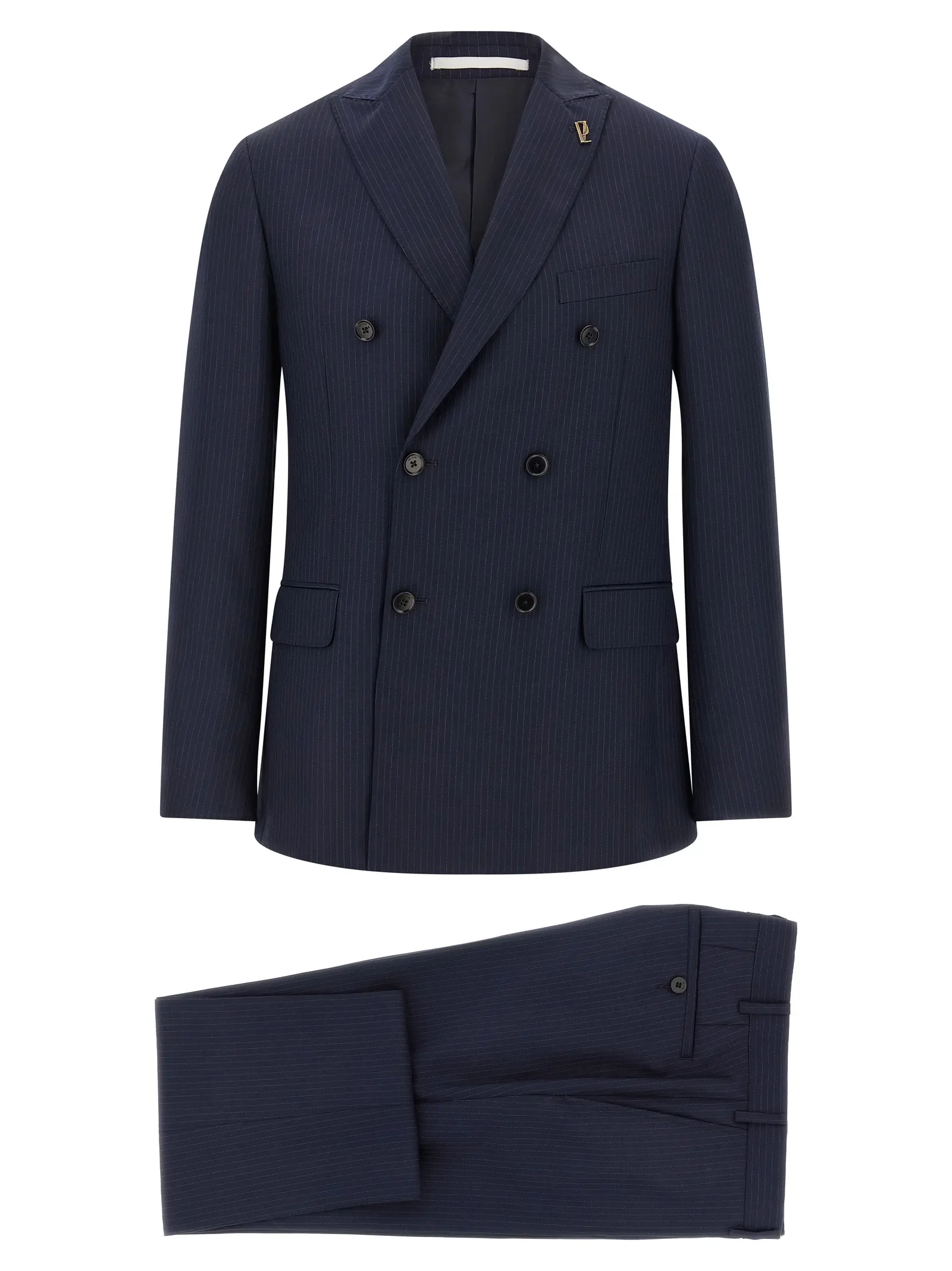 Чоловічий костюм синього кольору з колекції Lord Pal Zileri виготовлений із високоякісної вовни з віскозною підкладкою, що забезпечує комфорт і досконалу посадку. Двобортний піджак із відкладним коміром та піковими лацканами, прикрашеними знімною металевою брошкою, підкреслює вишуканий стиль і статус, доповнений функціональними кишенями та структурованими плечима. Штани зі стрілками, еластичними складками та продуманою застібкою поєднують інноваційність із класичною елегантністю, створюючи універсальний образ для будь-яких урочистих подій.