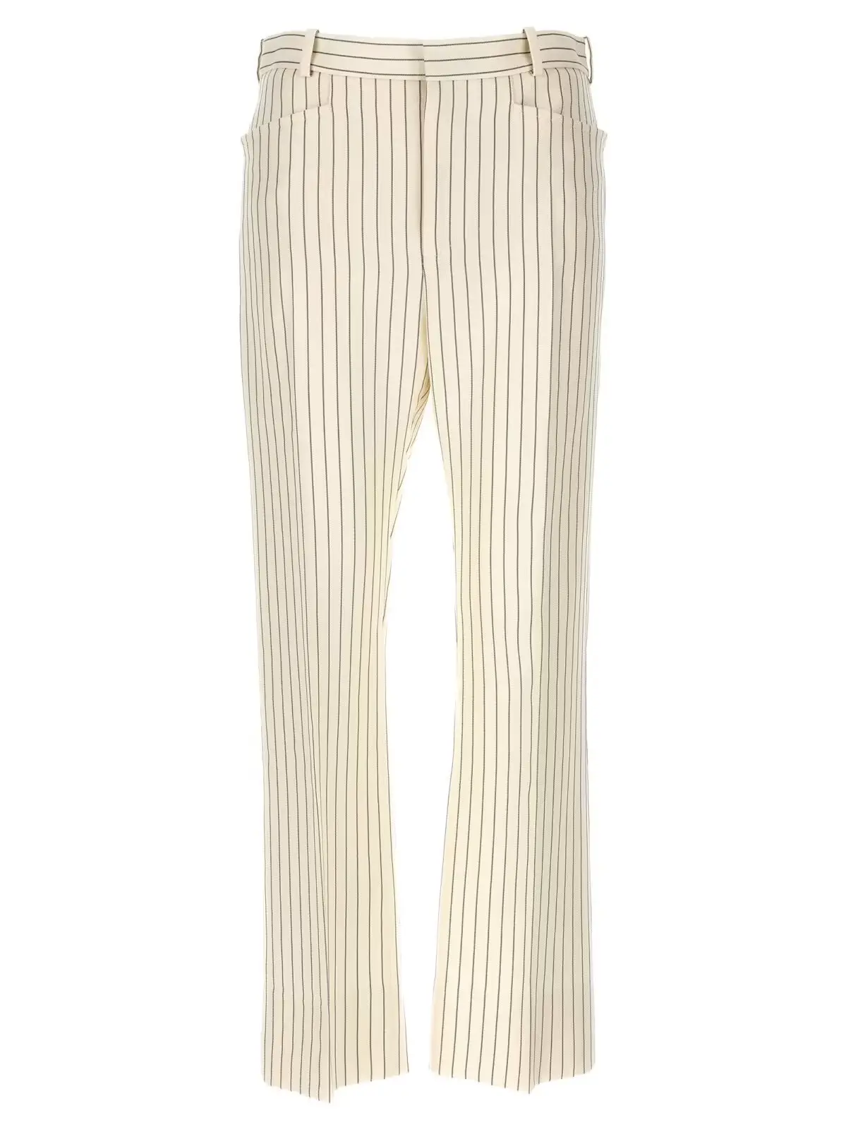 Костюмні штани від Tom Ford у чорно-білому кольорі з пінстріпом. Виготовлені зі шерсті та шовку, прямого крою з центральним згином. Склад: 79% шерсть, 17% шовк, 4% поліестер.