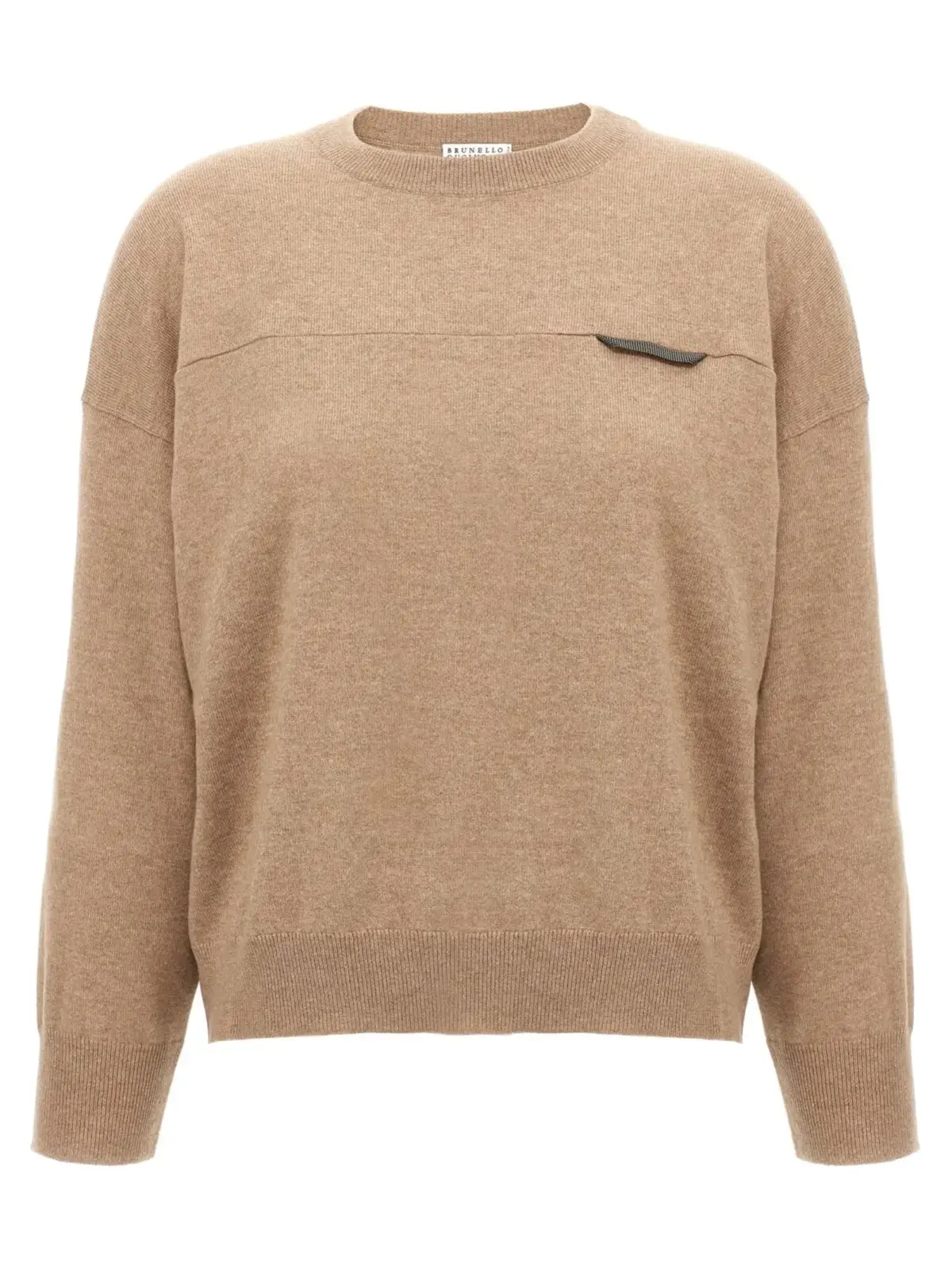 Елегантний жіночий кроп-светр бежевого відтінку виконаний із 100% кашеміру, що забезпечує неймовірну м’якість і комфорт. Витончений дизайн із круглою горловиною, довгими рукавами з манжетами та акцентом Monile сполучає інноваційність і універсальність, підкреслюючи статус і неперевершений стиль.