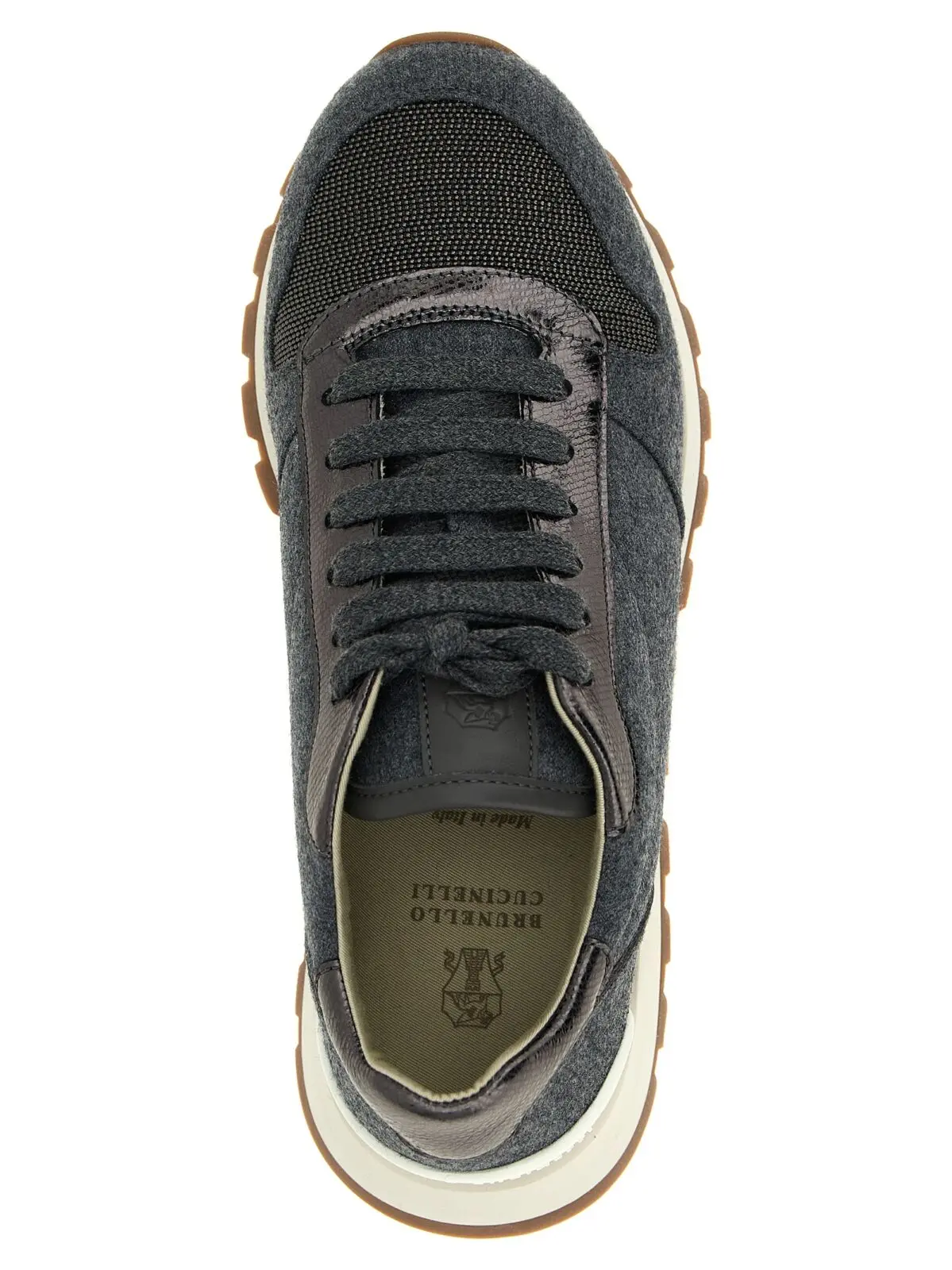 Елегантні жіночі кросівки Brunello Cucinelli виготовлені з 100% першосортної вовни з ламінованими шкіряними деталями та унікальним дизайном носка Monile, що поєднує інноваційність і комфорт. Вишуканий сірий відтінок, шнурівка та гумова підошва забезпечують універсальність і статусний стиль для будь-якого образу.