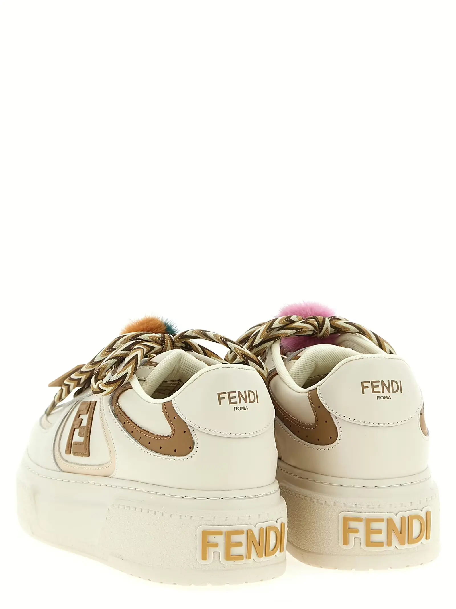 Елегантні жіночі кросівки Fendi Match виготовлені з високоякісної телячої шкіри, прикрашені тисненим логотипом на п’яті та язичку, оснащені шнурівкою з декоративним шнурком і знімною норковою прикрасою. Платформена гумова підошва з витонченим макрологотипом підкреслює інноваційність і статус, забезпечуючи неперевершений стиль та універсальність для будь-якого образу.